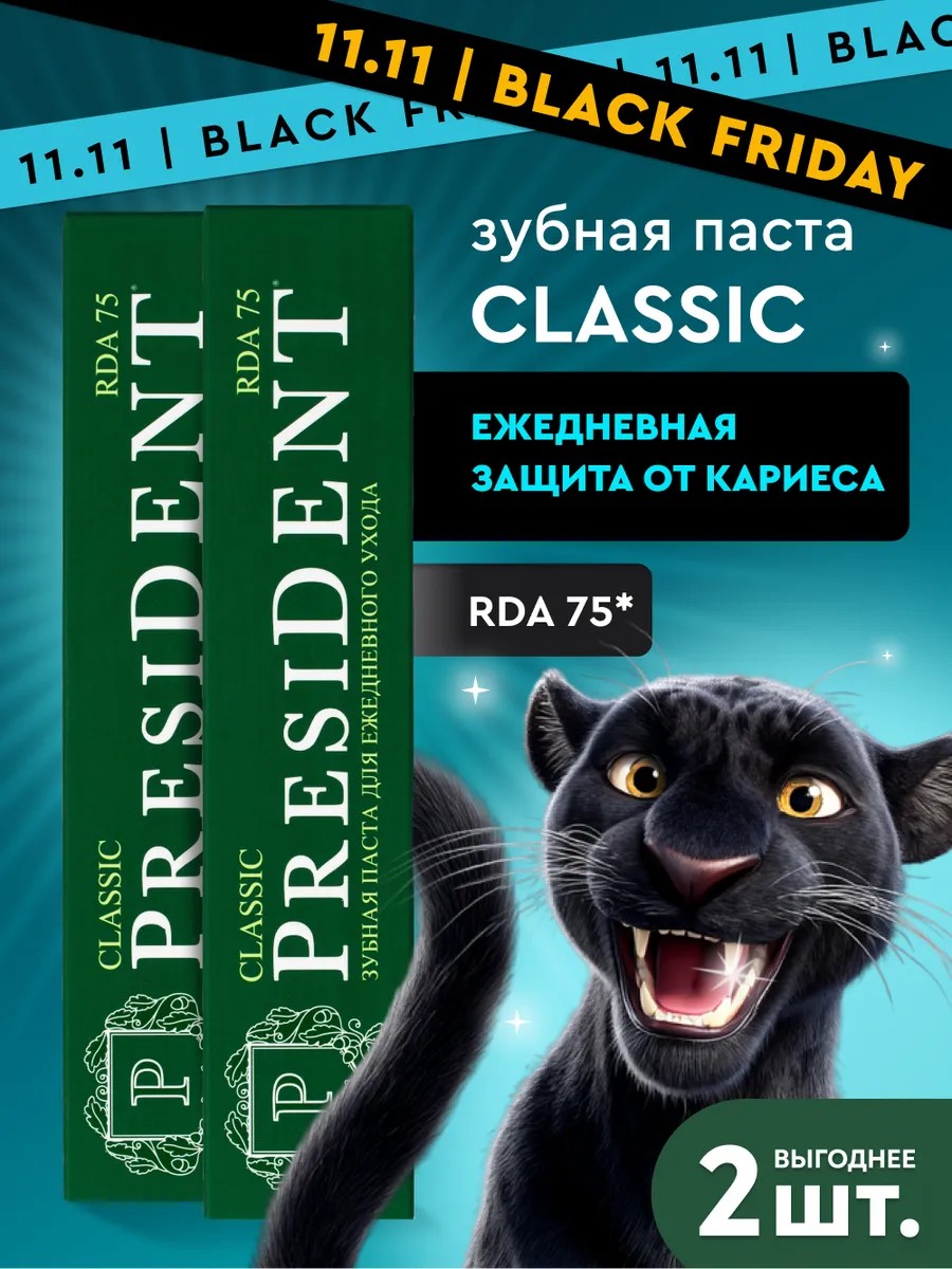 PRESIDENT Classic toothpaste with RDA 75 is designed for daily care, helps preserve fillings and prevents caries in the restoration areas. Active ingredients: Sage and chamomile reduce inflammation; Xylitol inhibits bacterial growth; Fluoride strengthens enamel and protects against caries; Mint gently freshens breath; Pyrophosphates slow down the formation (mineralization) of tartar. Clinically proven effectiveness:; Reduces plaque by 56%; Helps reduce periodontal inflammation by 65%. RDA is a controlled indicator of toothpaste abrasiveness. Caring for your health always begins with oral hygiene. Because only healthy teeth can guarantee the health of the entire body. How to achieve this? Use high-quality care products that give good results. That is why our toothpaste for sensitive teeth is so popular among connoisseurs of truly worthy products. Each President product is a true work of art in the field of health care for each person. If you have the option to choose something natural, you should definitely do so. This toothpaste doesn't cause allergies, discomfort, or other unpleasant side effects. A huge number of people around the world prefer President toothpaste as a versatile solution that solves several problems at once. It combats cavities, plaque, and gum sensitivity, all of which can be addressed in just a few uses. Therefore, it's definitely worth using this toothpaste as a true professional treatment and encouraging your loved ones to take advantage of this attractive solution. This whitening toothpaste contains an ideal formula created using innovative technologies. Hurry to treat yourself to a professional toothpaste that will leave no one indifferent!