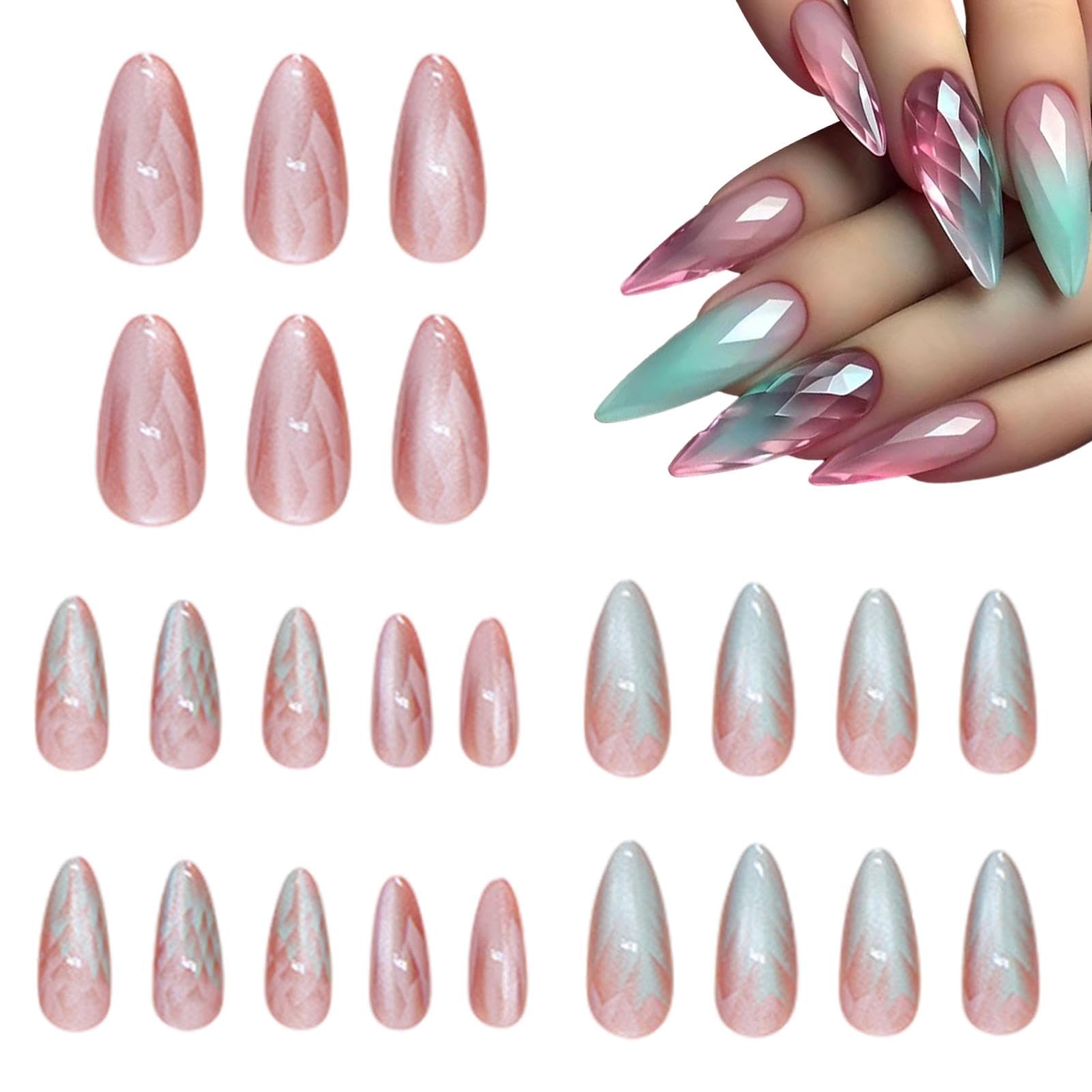 Press On Nails - Medium False Nails Ombre Almond 12 Sizes Cat Eye Artificial Press On Nails Includes Nail File For Woman