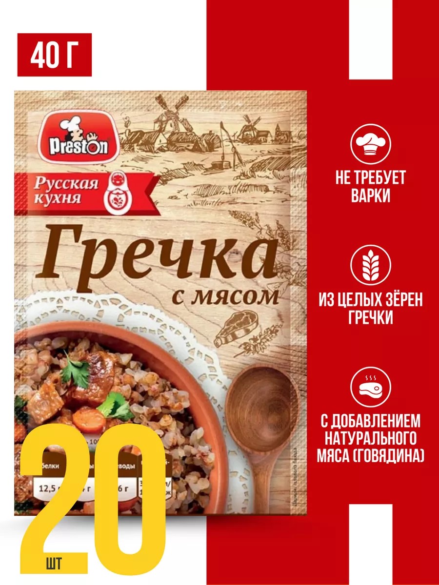 A distinctive feature of Pr. Preston buckwheat is that it is made not from flakes, but from whole buckwheat grains, which are steamed for quick cooking. This technology preserves all the micronutrients and vitamins of this rich grain. At home, at work, on the road, or at the dacha, simply pour boiling water over the contents of a packet of rice, buckwheat, or mashed potatoes and satisfy your hunger with a delicious meal. Porridge with mushrooms and fried onions is suitable for vegetarians and during Lent.