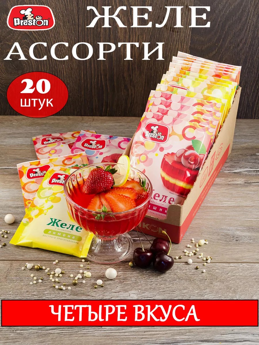 Желе Preston – это отличная возможность быстро приготовить вкусный и полезный десерт. Наше желе не содержит искусственных красителей, ароматизаторов и консервантов, является полностью натуральным продуктом. Предлагаем набор из четырех самых интересных вкусов для любого настроения. Это необычайно легкий десерт, в нем практически нет калорий. Это идеальное решение для сладкоежек на правильном питании, приверженцев здорового образа жизни и спортсменов. Желе является не просто сладостью, а достаточно полезным для нашего организма продуктом. Желирующие агенты естественного происхождения укрепляют здоровье сразу по нескольким направлениям. Желе позволяет улучшить состояние кожи и волос. Благодаря содержанию в продукте естественных аминокислот ускоряется процесс создания новых клеток. Желе считается одним из лучших перекусов после силового тренинга и любого фитнеса. Кроме того, его рекомендуют употреблять при депрессиях и нервных расстройствах. Фруктовое желе содержит множество необходимых углеводов, а также витамин B, повышающий иммунитет. Особенно вкусным желейный десерт может получиться, если приготовить его с кусочками фруктов и ягодами. Благодаря несомненной пользе и необычному исполнению, этот десерт идеально встраивается в повседневный рацион, а благодаря простоте быстрого приготовления и безграничному простору для кулинарных экспериментов, желе станет настоящим украшением праздничного стола. А еще желе Preston отлично держит форму!