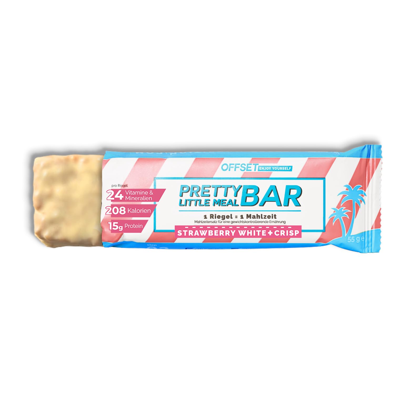 Your Pretty Little Meal Bar is a balanced meal that contains important nutrients that your body needs: plenty of proteins, 24 vitamins and minerals, essential omega fatty acids fiber so that you can replace your main meal - without any malnutritionCalories.And since the Pretty Little Meal is composed exactly according to EU guidelines and German diet regulation, it can call itself a full meal.Pretty smart, rightIngredients ingredients Soy nuggets [isolated soy protein, tapiocastrecy, dining salt], white chocolate cocoa tapes with a cocoa content of min. (gluten -free), Soy protein, glucose syrup, strawberry (not EU) [Lyophilized strawberry, strawberry juice concentrate], mineral salt mix [potassium citrate, calcium phosphate (calcium salt of orthophosphoric acid), sodium citrate, magnesium oxide Manganese sulfate, copper sulfate, potassium iodide, Sodium selenite], moisture-keeping: maltitol syrup, bufffree, sunflower oil, moisture, aroma, emulsifier Sojalecithin, acid regulator: citric acid, vitamin mix: [thiamin hydrochloride, riboflavin, pyridoxin hydrochloride, d-bioin Monoglutamic acid, Nicotinamid, Calciuim D-Panthothotheneat,Cyanocobalamin, DL-Alpha Tocopheryl Acetate, Retinyl AcetaT, Maltodextrin], acid regulator: citric acid, L-escorbic acid (vitamin C), phytomenadion (vitamin K), cholecalcipherol (vitamin D3).Can contain traces of gluten, egg, peanuts, shell fruits, Sulfite Sesame. Instructions Pretty Little Meal supports you in losing weight if you replace 2 main meals a day with a Pretty Little Meal bar as part of a low-calorie diet, such as our offset plan.Pretty Little Meal supports you in keeping weight if you then replace 1 main meal a day with a Pretty Little Meal bar as part of a low-calorie diet, such as our offset plan.Pretty Little Meal only fulfills her intended purpose in this context.Other foods must be part of this diet.Look into our free offset app with many delicious recipes for mixed meals.Drink 2-3 liters of water every day.To lose weight, two main meals should be replaced by a Pretty Little Meal meal every day.To keep the weight, one main meal should be replaced by a Pretty Little Meal meal every day. Warnings Can contain traces of gluten, egg, peanuts, milk, shell fruits, sulfite sesame.Meal for a weight -controlling diet. Address manufacturer importer Famous Brands GmbH C O Design Offices Erftstraße 15-17 50672 Cologne Germany More: Our step-by-step plan helps to learn and enjoy a healthy, balanced diet-for a new feeling of wellbeing and long-term success.-: With the biotin, selenium and iodine it contains, the Pretty Little Meal meal steals healthy hair, skin and nails while you pamper yourself.-: Enjoy delicious meals while you keep your weight or take off- with the Pretty Little Meal bar you can compensate for your calorie and nutrient balance after a cheat day.-: Each bar delivers up to 16g of vegetable protein for a balanced diet and thus supports you in maintaining your muscle mass.---: perfect, full meal for on the go, 100 vegan lactose-free, 1 bar 1 meal.Dein Pretty Little Meal Bar ist eine ausgewogene Mahlzeit, die wichtige Nährstoffe enthält, die dein Körper benötigt: Reichlich Proteine, 24 Vitamine und Mineralien, essentielle Omega Fettsäuren Ballaststoffe, so dass du deine Hauptmahlzeit damit ersetzen kannst - ganz ohne Mangelernährung und das bei wenig Kalorien. Und da das Pretty Little Meal exakt nach EU-Richtlinien und deutscher Diätverordnung zusammengesetzt ist, darf es sich eine vollwertige Mahlzeit nennen. Ganz schön smart, oderINHALTSSTOFFE ZUTATEN SOJA Nuggets [isoliertes SOJAPROTEIN, Tapiokastärke, Speisesalz], Weiße Schokoladenkakaofeststoffe mit einem Kakaoanteil von min. 34 [Zucker, Kakaobutter, ganzes MILCHpulver, MOLKENpulver, Emulgatoren: Lecithine (SOJA) und Polyglycerinpolyricinoleat, Aroma] (20 ), HAFERflocken (glutenfrei), SOJAPROTEIN, Glucosesirup, Erdbeere (nicht EU) [lyophilisierte Erdbeere, Erdbeersaftkonzentrat] (7,5 ), Mineralsalzmix [Kaliumcitrat, Calciumphosphat (Calciumsalz der Orthophosphorsäure), Natriumcitrat, Magnesiumoxid, Maltodextrin, Eisenfumarat, Zinksulfat, Mangansulfat, Kupfersulfat, Kaliumiodid, Natriumselenit], Feuchthaltemittel: Maltitolsirup, Puffreis, Sonnenblumenöl, Feuchthaltemittel: Glycerin, Aroma, Emulgator SOJALECITHIN, Säureregulator: Zitronensäure, Vitaminmix: [Thiamin Hydrochlorid, Riboflavin, Pyridoxin hydrochlorid, D-Biotin, saures Pteroylmonoglutaminsäure, Nicotinamid, Calciuim D-Panthotheneat, Cyanocobalamin, DL-alpha Tocopheryl Acetat, Retinyl Acetat, Maltodextrin], Säureregulator: Zitronensäure, L-Ascorbinsäure (Vitamin C), Phytomenadion (Vitamin K), Cholecalcipherol (Vitamin D3). KANN SPUREN VON GLUTEN, EI, ERDNÜSSEN, SCHALENFRÜCHTEN, SULFITE SESAM enthalten. GEBRAUCHSANWEISUNG Pretty Little Meal unterstützt dich beim Abnehmen, wenn du 2 Hauptmahlzeiten am Tag mit je einem Pretty Little Meal-Riegel im Rahmen einer kalorienarmen Ernährung, wie unserem OFFSET-Plan, ersetzt. Pretty Little Meal unterstützt dich beim Gewichthalten, wenn du danach 1 Hauptmahlzeit am Tag mit einem Pretty Little Meal-Riegel im Rahmen einer kalorienarmen Ernährung, wie unserem OFFSET-Plan, ersetzt. Pretty Little Meal erfüllt nur in diesem Rahmen ihren angestrebten Zweck. Andere Lebensmittel müssen Teil dieser Ernährung sein. Schaue dafür auch in unsere kostenlose OFFSET-App mit vielen leckeren Rezepten für Mixed Meals. Trinke dazu täglich 2-3 Liter Wasser. Um abzunehmen, sollten täglich zwei Hauptmahlzeiten durch je eine Pretty Little Meal-Mahlzeit ersetzt werden. Um das Gewicht zu halten, sollte täglich eine Hauptmahlzeit durch eine Pretty Little Meal-Mahlzeit ersetzt werden. WARNHINWEISE Kann Spuren von Gluten, Ei, Erdnüssen, Milch, Schalenfrüchten, Sulfite Sesam enthalten. Mahlzeitersatz für eine gewichtskontrollierende Ernährung. ANSCHRIFT HERSTELLER IMPORTEUR Famous Brands GmbH c o Design Offices Erftstraße 15-17 50672 Köln Deutschland Mehr: Unser Schritt-für-Schrit