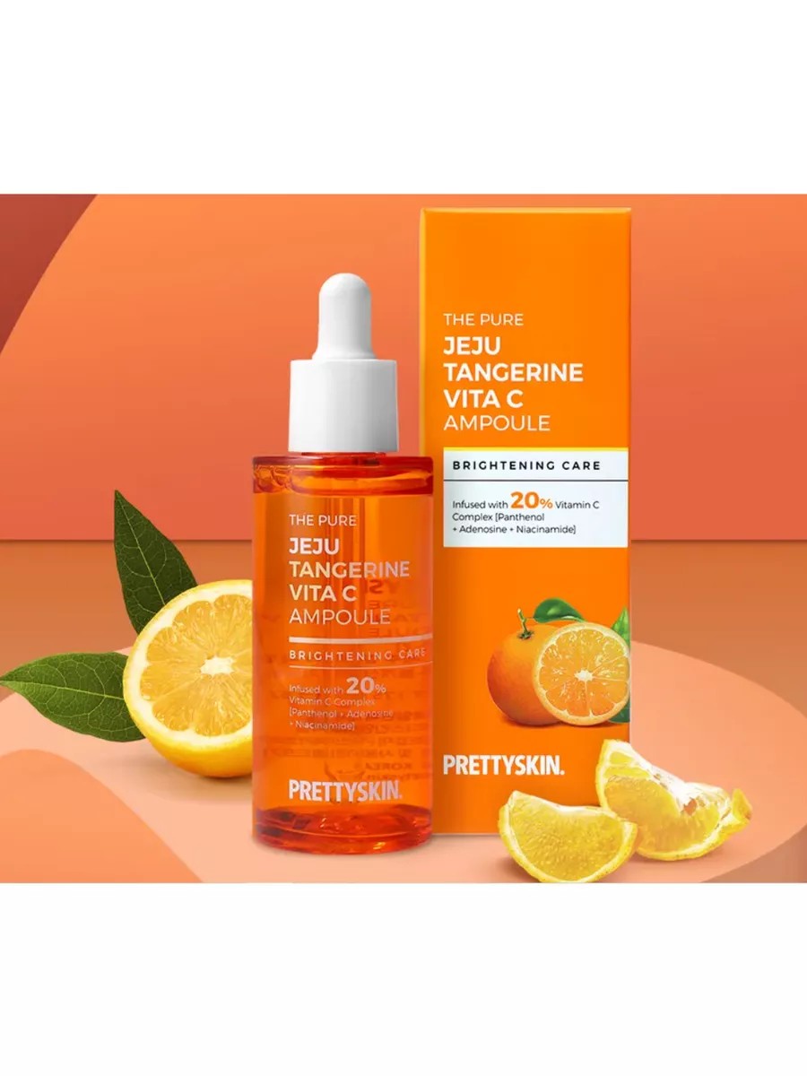 Using the Prettyskin The Pure Jeju Tangerine Vita C Ampoule serum, containing 20% vitamin C complex, panthenol, niacinamide, and adenosine, will help restore whitening and even out skin tone, and also soothe and moisturize the skin.