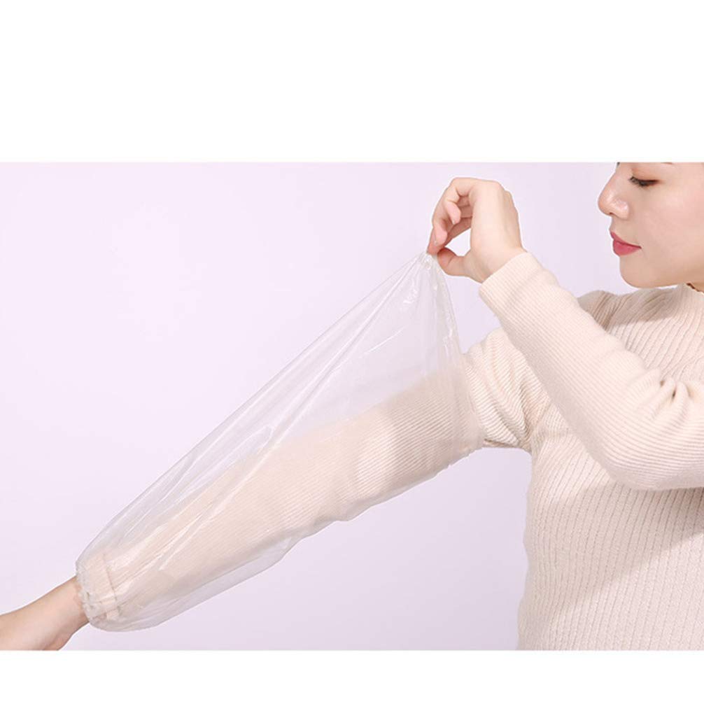 Description These Disposable arm sleeves are made of quality material, breathable and convenient. With the Waterproof sleeves, you can effectively prevent pollution while cooking. Good helper for you. Features - Material: CPE. - Color: Transparent. - Size: 40x23x0.1cm. - This is one-time use oversleeve. It can be thrown when used up. - It is useful and practical, and fit for most adult. - With elastic design on the ends, fit your hands and arms well. - Elastic band on the upper arm allows maximum freedom of movement, keeping the sleeves in place without slipping down or bunch up. - Application: factory, hairdressing, catering service, food processing, household use, etc. Package Including 10 x disposable arm sleevesThis is one-time use oversleeve. It can be thrown when used up. Application: factory, hairdressing, catering service, food processing, household use, etc. With elastic design on the ends, fit your hands and arms well. It is useful and practical, and fit for most adult. Elastic band on the upper arm allows maximum freedom of movement, keeping the sleeves in place without slipping down or bunch up.