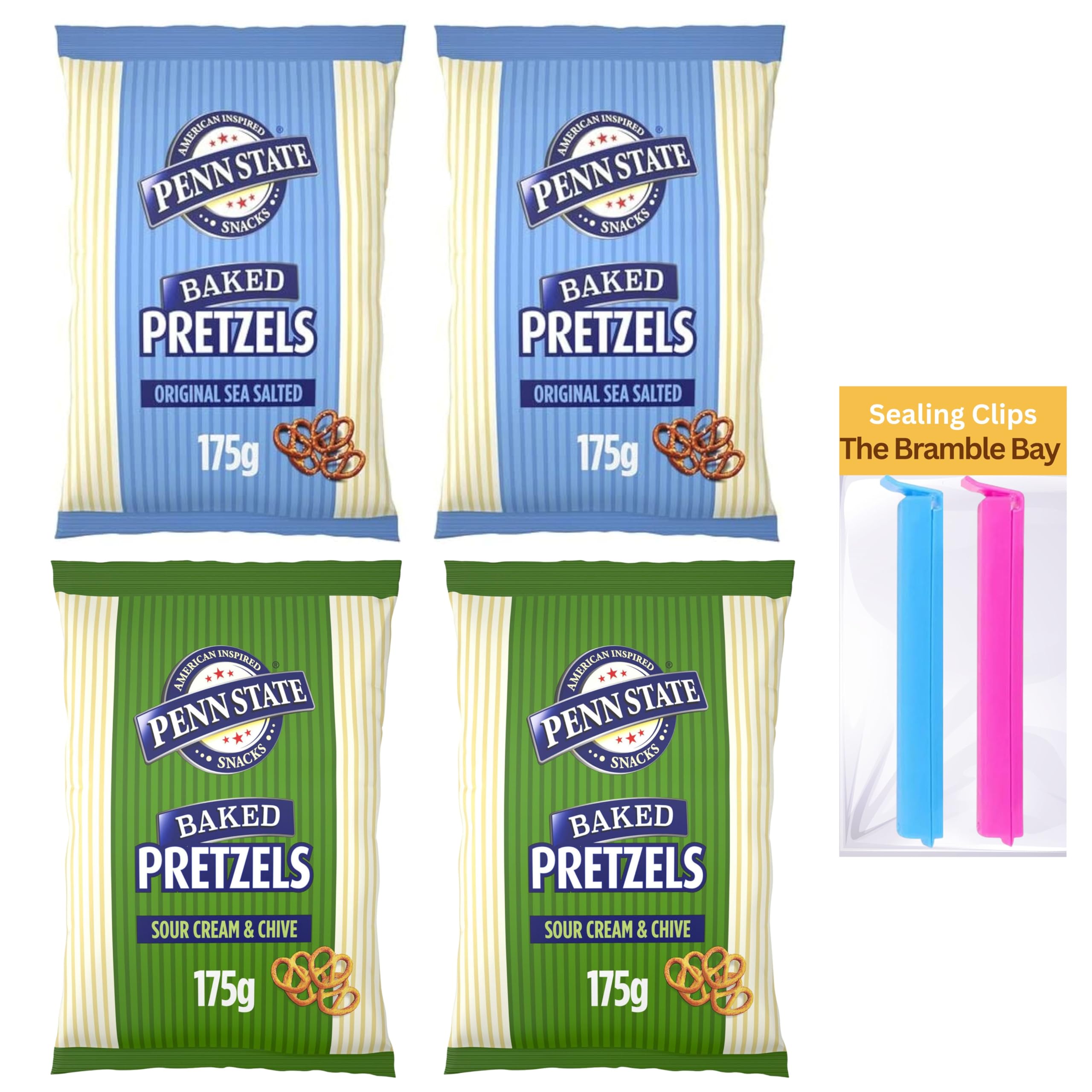 Penn State Pretzels bundle contains Original Sea Salted Flavour 175g x2, Sour Cream & Chive 175g x2, Sealing Clips x2 Original Sea Salted Flavour 175g Crunchy Texture: Sea-salted pretzels are known for their satisfying crunch, making them a popular snack choice for those who enjoy a hearty texture. Balanced Flavor: The sea salt seasoning provides a perfect balance of saltiness to enhance the pretzel's flavor without overwhelming it. Savory and Salty: Sea-salted pretzels offer a classic savory and salty taste that pairs well with a variety of dips, cheeses, and spreads. Sour Cream & Chive 175g Unique Flavor: Sour cream & chive flavored pretzels offer a distinctive taste profile that combines the tangy creaminess of sour cream with the savory and aromatic notes of chives. Savory and Tangy: These pretzels provide a savory and tangy flavor experience, making them an excellent choice for those who enjoy bold and zesty snacks. Balanced Seasoning: The seasoning is typically well-balanced, ensuring that neither the sour cream nor the chive flavor overpowers the other, creating a harmonious blend of tastes. Sealing Clips Food Preservation: Food sealing clips are designed to create an airtight seal, which helps preserve the freshness and flavor of your food. INGREDIENTS Flour (Wheat Flour, Calcium, Iron, Niacin, Thiamin), Rapeseed Oil, Sea Salt, Dextrose, Dried Yeast, Acidity Regulator: Sodium HydroxideFOOD PRESERVATION: Food sealing clips are designed to create an airtight seal, which helps preserve the freshness and flavor of your food. EASY TO USE: These clips are typically easy to use. CRUNCHY TEXTURE: Like traditional pretzels, sour cream & chive pretzels maintain a satisfying crunch, offering a textural contrast to the creamy and savory seasoning. SAVORY AND TANGY: These pretzels provide a savory and tangy flavor experience, making them an excellent choice for those who enjoy bold and zesty snacks. UNIQUE FLAVOR: Sour cream & chive flavored pretzels offer a distinctive taste profile that combines the tangy creaminess of sour cream with the savory and aromatic notes of chives. BALANCED SEASONING: The seasoning is typically well-balanced, ensuring that neither the sour cream nor the chive flavor overpowers the other, creating a harmonious blend of tastes. VERSATILITY: They are a versatile snack, suitable for munching on their own, adding to party platters, or incorporating into recipes like pretzel-crusted chicken or desserts. SAVORY AND SALTY: Sea-salted pretzels offer a classic savory and salty taste that pairs well with a variety of dips, cheeses, and spreads. BALANCED FLAVOR: The sea salt seasoning provides a perfect balance of saltiness to enhance the pretzel's flavor without overwhelming it. CRUNCHY TEXTURE: Sea-salted pretzels are known for their satisfying crunch, making them a popular snack choice for those who enjoy a hearty texture.