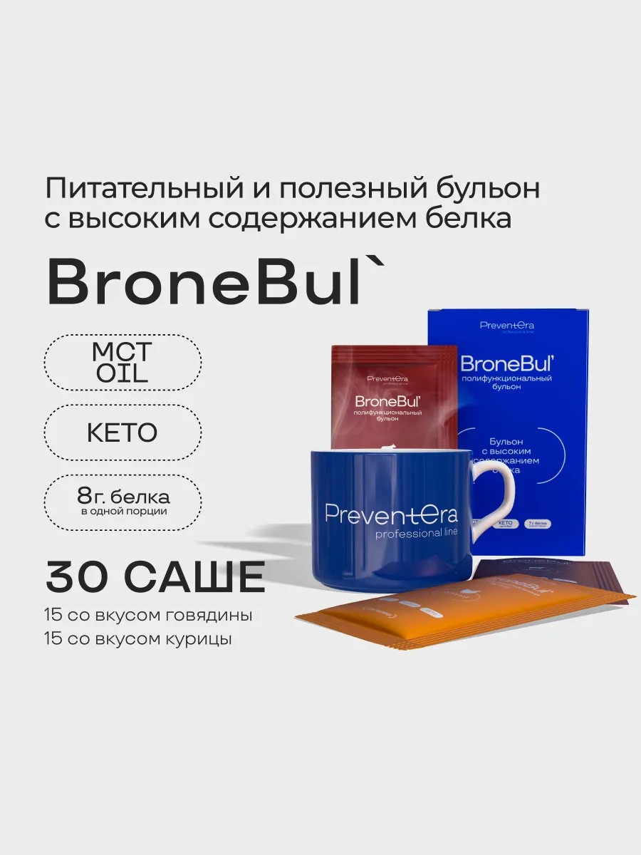 BroneBul' - комплексный продукт для мультивекторной поддержки здоровья костей, суставов, сухожилий, хрящей, связок, а также кожи, волос и ногтей. Представляет собой богатый источник белка (особенно, коллагена), минералов и других биологически активных соединений. Дополнительно обогащен среднецепочечными триглицеридами кокосового масла MCT, гиалуроновой кислотой, глюкозамином сульфатом.