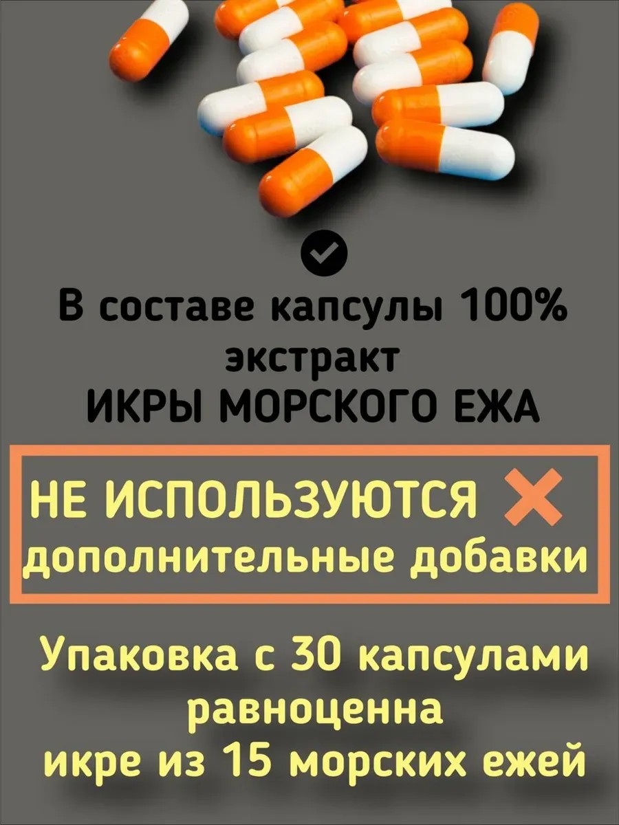 | Состав | Экстракт икры морского ежа, B12, A, C, E, PP, D, Омега 3, Омега 6, йод |