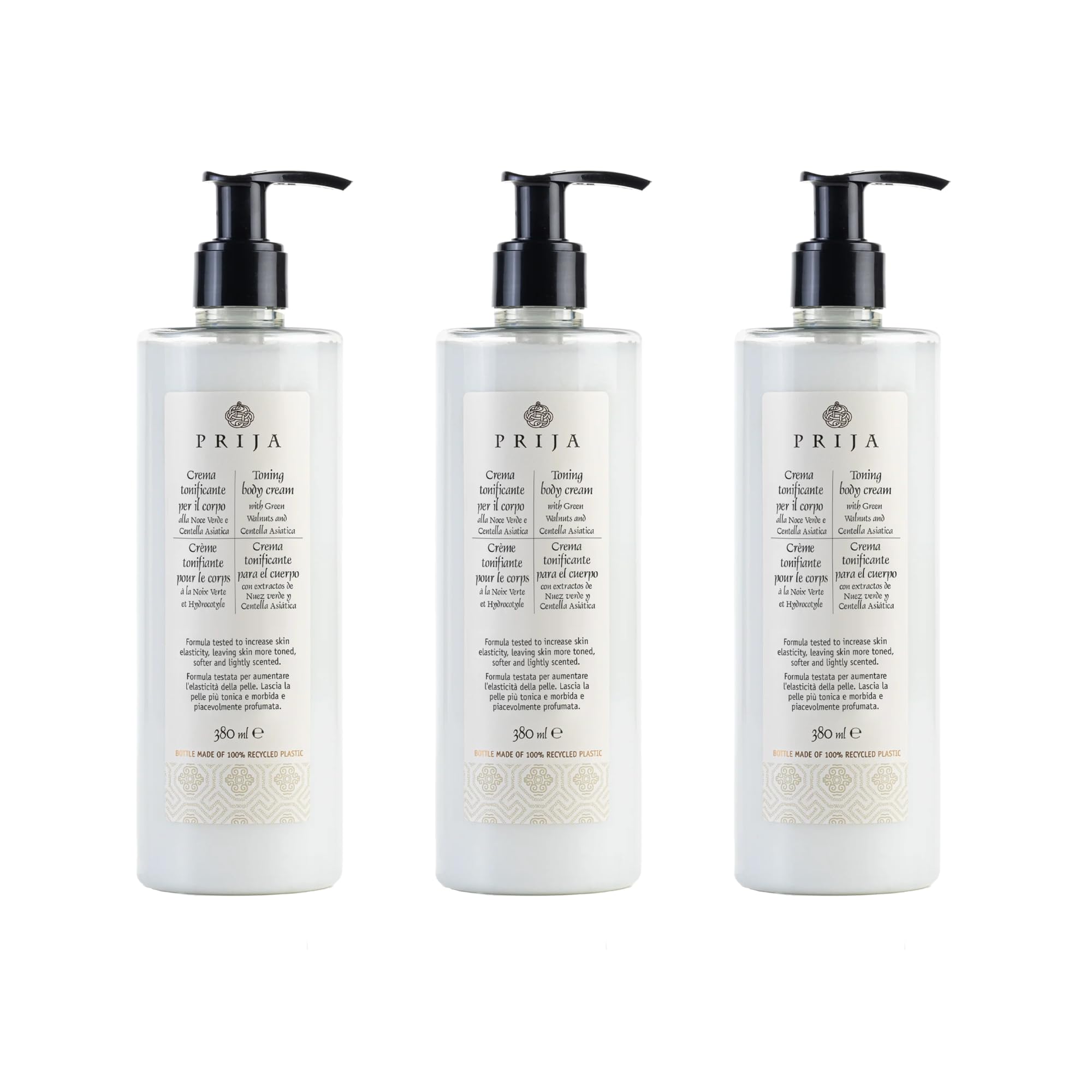Enjoy the benefits of toned, softer skin, complemented by the captivating warmth of its delightful fragrance. Transform your daily skincare routine into a truly pleasurable sensory experience with the warm and relaxing scent of Prija. This toning body cream nourishes your skin and delivers a soothing and aromatic sensory experience. Treat your skin to a surge of hydration and improved elasticity with Prija's special formula. Avocado oil and green walnut extract work together to nourish and regenerate, leaving your skin supple and resilient. Prija Toning Body Cream is carefully formulated for more toned and visibly softer skin. Discover its refined blend of ingredients, including avocado oil and green walnut extract, which work harmoniously to enhance your skin's texture. Experience the essence of Italian beauty with Prija Toning Body Cream, made entirely in Italy, guaranteeing an authentic experience.Profitez des bienfaits d'une peau tonifiée et plus douce, complétée par la chaleur captivante de son délicieux parfum. Transformez votre routine de soins quotidienne en un véritable moment de plaisir sensoriel grâce au parfum chaleureux et relaxant de Prija. Cette crème tonifiante pour le corps nourrit votre peau et offre une expérience sensorielle apaisante et aromatique. Offrez à votre peau une vague d'hydratation et une élasticité améliorée grâce à la formule spéciale de Prija. L'huile d'avocat et l'extrait de noix verte s'associent pour nourrir et régénérer, laissant votre peau souple et résiliente. La Crème Corps Tonifiante Prija est soigneusement formulée pour une peau plus tonique et visiblement plus douce. Découvrez son mélange raffiné d'ingrédients, dont l'huile d'avocat et l'extrait de noix verte, qui agissent harmonieusement pour sublimer la texture de votre peau. Découvrez l'essence de la beauté italienne avec la crème tonifiante pour le corps Prija, entièrement fabriquée en Italie, garantissant une expérience authentique.Prija Crème Corporelle Tonifiante Augmente l'Hydratation et l'Élasticité avec de l'Huile d'Avocat et de l'Extrait de Noyer Vert, Crème Hydratante Corporelle Légèrement Parfumée 3 x 380ml