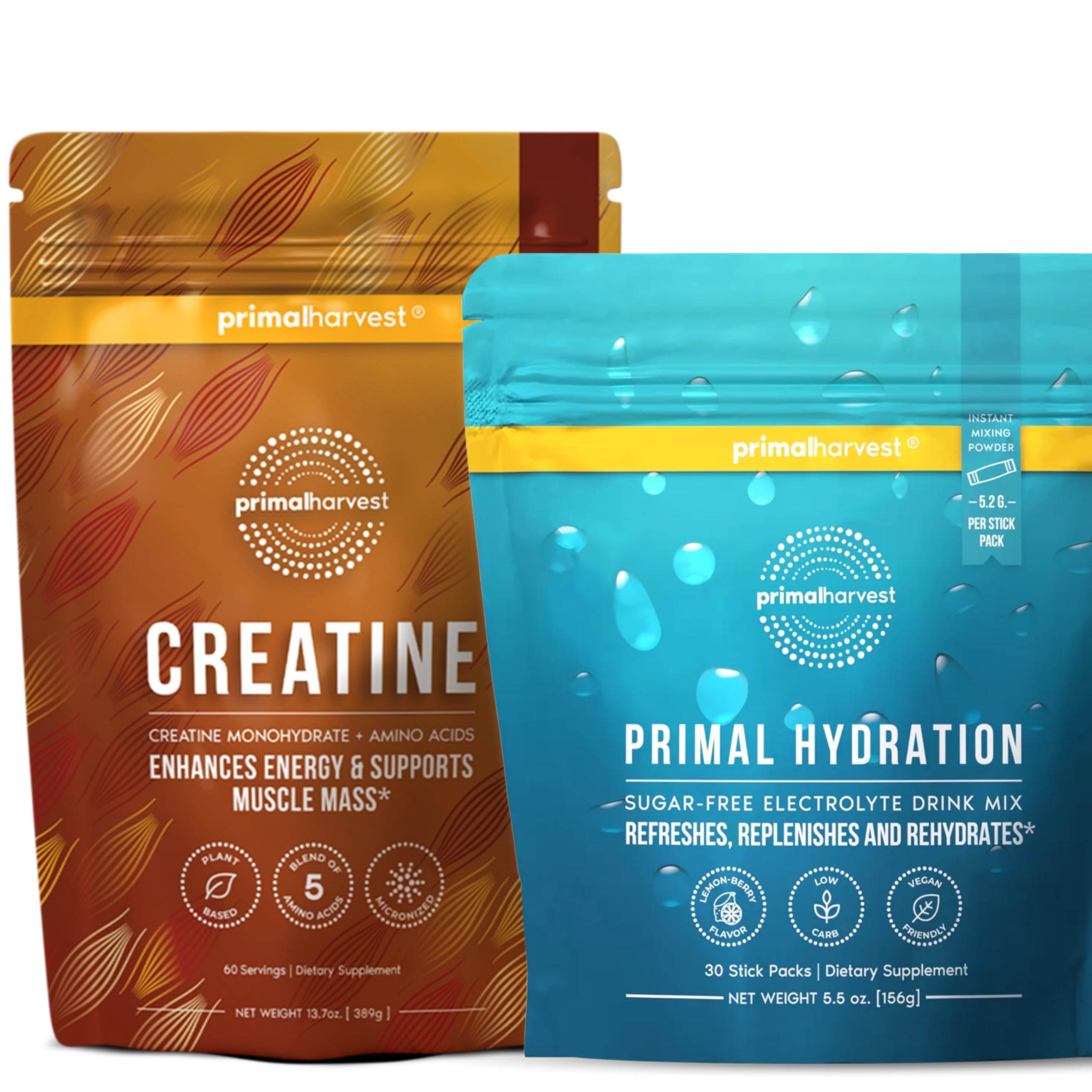 The Primal Creatine Hydration Bundle by Primal Harvest is designed to support performance, recovery, and daily hydration, two key components of a well-rounded wellness routine. Whether you're working out, staying active, or just managing a busy schedule, this 2-pack provides targeted support to help keep you energized and replenished. Primal Creatine delivers pure creatine monohydrate, a highly researched ingredient known for supporting muscle strength, endurance, and power. It's unflavored and easy to mix, making it simple to incorporate into your pre- or post-workout shake or beverage of choice. Primal Hydration is formulated with a balanced blend of electrolytes and trace minerals, like sodium, potassium, and magnesium, to help support hydration, especially during physical activity or heat exposure. With no added sugars and a light, refreshing taste, it's an easy way to help replenish lost fluids and stay hydrated throughout the day. Together, this bundle offers a convenient combination of performance and hydration support, made without gluten, dairy, or soy. Whether you're training hard or simply staying on top of your wellness goals, the Primal Creatine Hydration Bundle provides clean, straightforward support to help you feel your best.Clean, Active Lifestyle Formula : Both products are free from gluten, dairy, soy, and artificial additives, crafted for daily routines and active individuals. Naturally Flavored Easy to Use : Features a light lemon-berry taste with no added sugar. Creatine is unflavored for versatile use in any beverage. Electrolyte Powder with Amino Acids : Primal Hydration includes key electrolytes like sodium, potassium, magnesium, and calcium, plus L-glutamine and B vitamins, often used in hydration-focused blends. Micronized Creatine Monohydrate : Each serving delivers 5g of unflavored creatine that mixes easily into water or shakes—ideal for supporting high-intensity workout routines. Performance Hydration Support Bundle : A convenient 2-pack pairing of Primal Creatine and Primal Hydration, designed to complement strength training, recovery, and daily hydration goals.