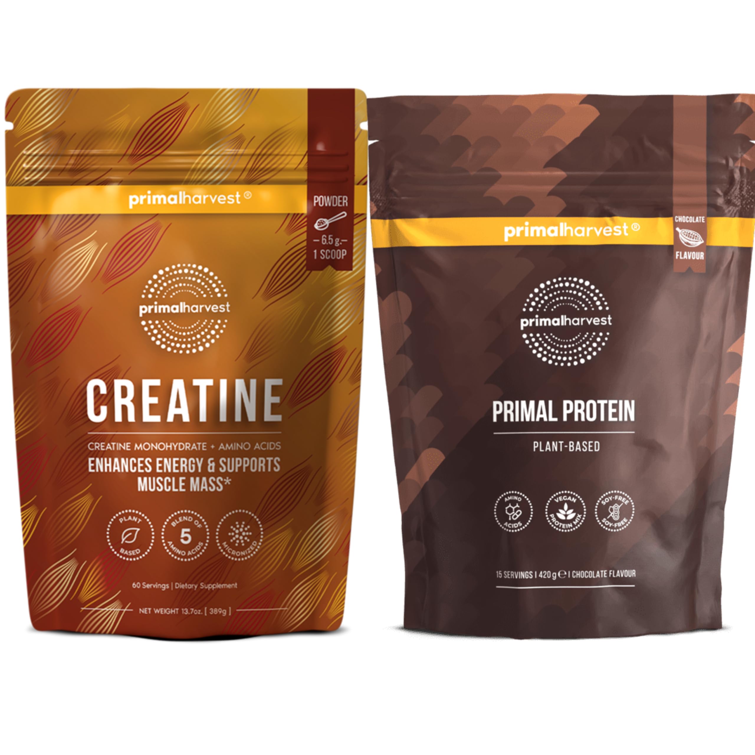 Primal Creatine Vegan Protein Bundle by Primal Harvest offers a balanced combination of performance and plant-based nutrition, designed to support strength, recovery, and daily wellness. Primal Creatine delivers pure creatine monohydrate, a well-researched compound known for supporting muscle performance, strength, and endurance. This unflavored, easy-to-mix powder integrates seamlessly into pre- or post-workout routines, making it a versatile addition to your fitness regimen. Primal Vegan Protein provides 20 grams of plant-based protein per serving, sourced from a blend of fava beans, chickpeas, and rice. This formula is crafted to support muscle recovery and daily nutrition, featuring a smooth chocolate flavor without added sugars. It's free from gluten, soy, and dairy, aligning with various dietary preferences. Together, this 2-pack bundle offers a comprehensive approach to fitness and nutrition, combining clean, effective support for active individuals. Whether you're fueling a workout or seeking balanced recovery, the Primal Creatine Vegan Protein Bundle is designed to help you stay on track with your wellness goals.Clean Label Formulas : Both products are gluten-free, dairy-free, soy-free, and made without artificial flavors, sweeteners, or preservatives. Easy to Mix, Great Taste : The protein offers a rich chocolate flavor with a smooth texture, while the unflavored creatine blends easily into water or shakes without affecting taste. Pure Micronized Creatine Monohydrate : Delivers 5g of unflavored creatine per serving, ideal for use alongside strength training, recovery, or active routines. Vegan Chocolate Protein with 20g per Serving : Made with a blend of plant-based proteins and natural chocolate flavor, providing a smooth, dairy-free option for your post-workout or daily shake. Plant-Based Protein Creatine Bundle : A 2-pack combination of Primal Creatine and Vegan Chocolate Protein designed to support daily performance and clean, plant-based nutrition.