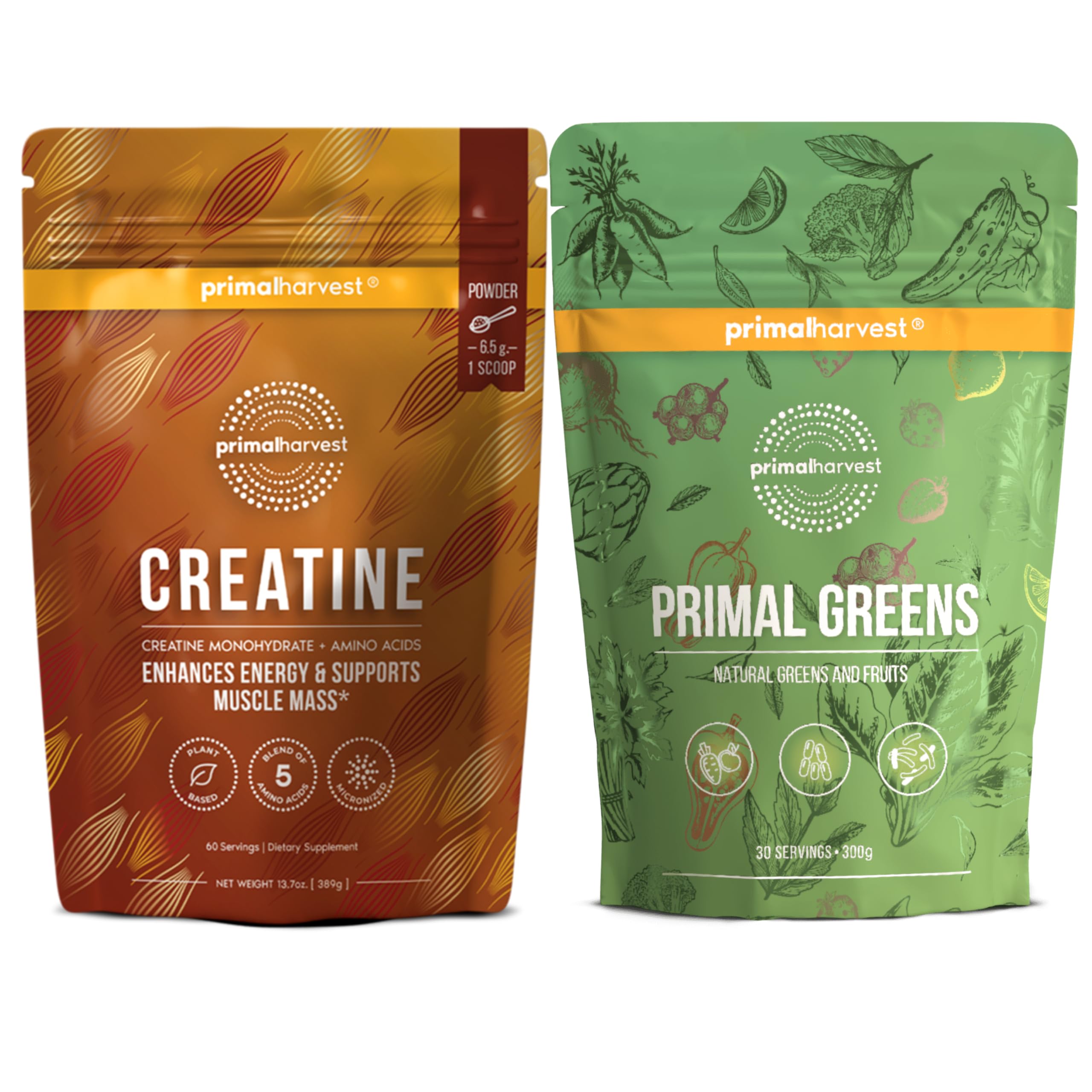 The Primal Harvest Creatine Greens Bundle combines two foundational supplements to help support strength, recovery, and everyday wellness. This convenient 2-pack includes: Primal Creatine: A pure creatine monohydrate powder designed to help support muscle performance, strength, and endurance. Unflavored and easy to mix, it's ideal for pre- or post-workout routines and fits seamlessly into any fitness-focused lifestyle. Whether you're training regularly or just looking to support lean muscle and recovery, Primal Creatine offers a simple, clean way to add this well-researched compound to your daily regimen. Primal Greens: A nutrient-dense superfood powder featuring a blend of fruits, vegetables, herbs, probiotics, and digestive enzymes. This all-in-one formula is designed to help support energy, digestion, immune health, and overall balance. With no added sugar and a refreshing natural taste, it's an easy way to help fill nutritional gaps and promote daily wellness. Together, these two products offer a well-rounded approach to performance and foundational health, supporting both your active lifestyle and your body's daily nutritional needs. Both formulas are made without gluten, dairy, or soy, providing high-quality support you can feel good about.Clean and Compatible with Active Lifestyles : Gluten-free, dairy-free, and soy-free formulas designed to support both fitness and nutrition goals in one simple bundle. Easy to Use : Both products dissolve easily in water, smoothies, or shakes with no added sugars, artificial flavors, or preservatives—perfect for daily use. Daily Superfood Greens Powder : Primal Greens features a blend of fruits, vegetables, probiotics, adaptogens, and digestive enzymes to help complement overall wellness and clean nutrition habits. Pure Micronized Creatine Monohydrate : Primal Creatine provides 5g of unflavored creatine per serving, ideal for strength training and athletic performance routines. 2-in-1 Wellness Performance Bundle : This convenient 2-pack includes Primal Greens and Primal Creatine, offering a combination of daily nutrition support and workout-friendly performance.