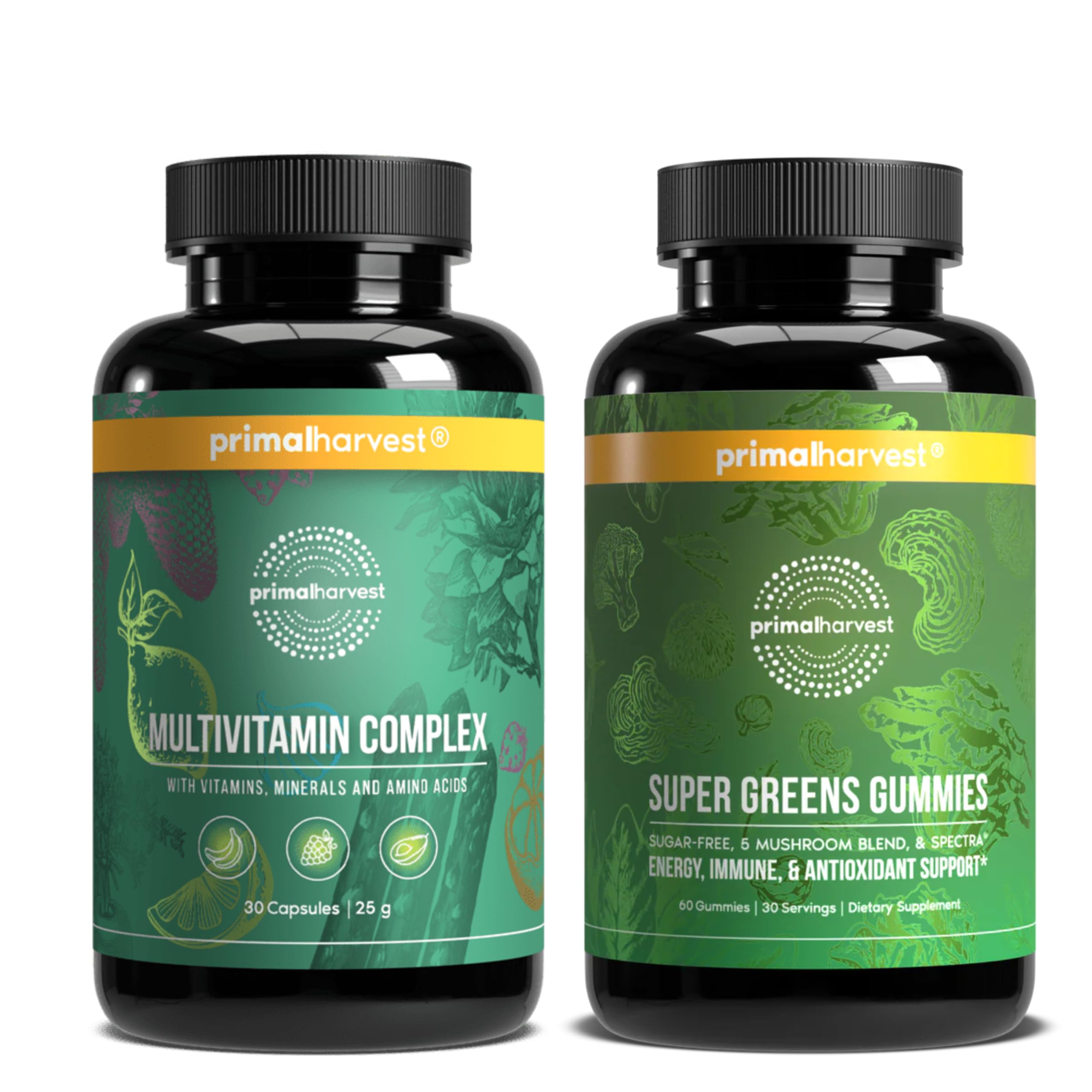 Primal Harvest Supergreens Gummies + Multivitamin | 2-Pack Bundle | 16 Superfoods + 21 Vitamins & Minerals | Gummies & Capsules | Food Supplement | 30 Servings Each