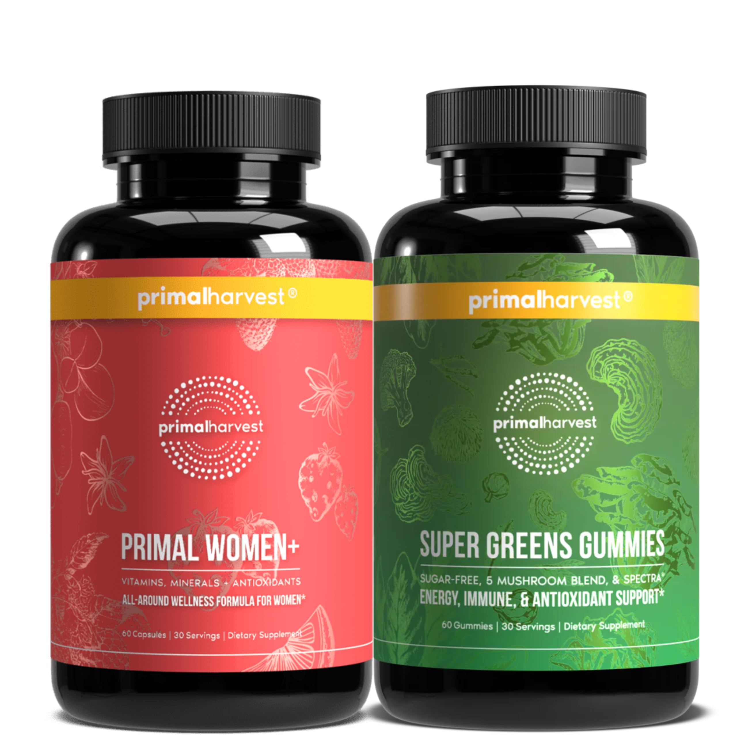 Primal Harvest Supergreens Gummies + Women+ | 2-Pack Bundle | 16 Superfoods + Botanicals Vitamins & Minerals for Women | Gummies & Capsules | Food Supplement | 30 Servings Each