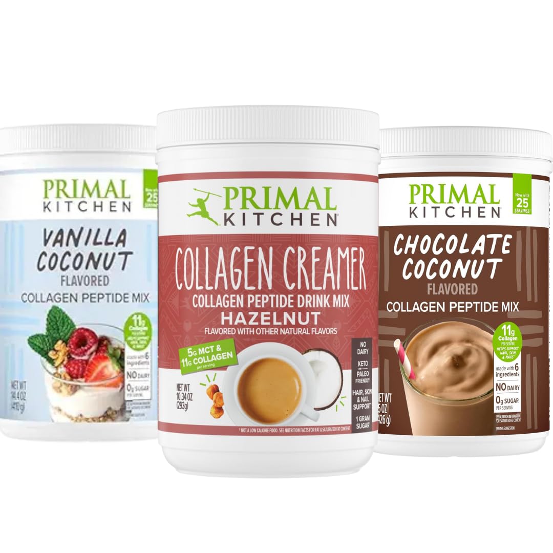 Primal Kitchen Collagen Powder Variety Pack Vanilla Coconut 14.4 oz Chocolate Coconut 15 oz Hazelnut 10.34 oz Paleo Friendly Keto Certified Collagen Peptides