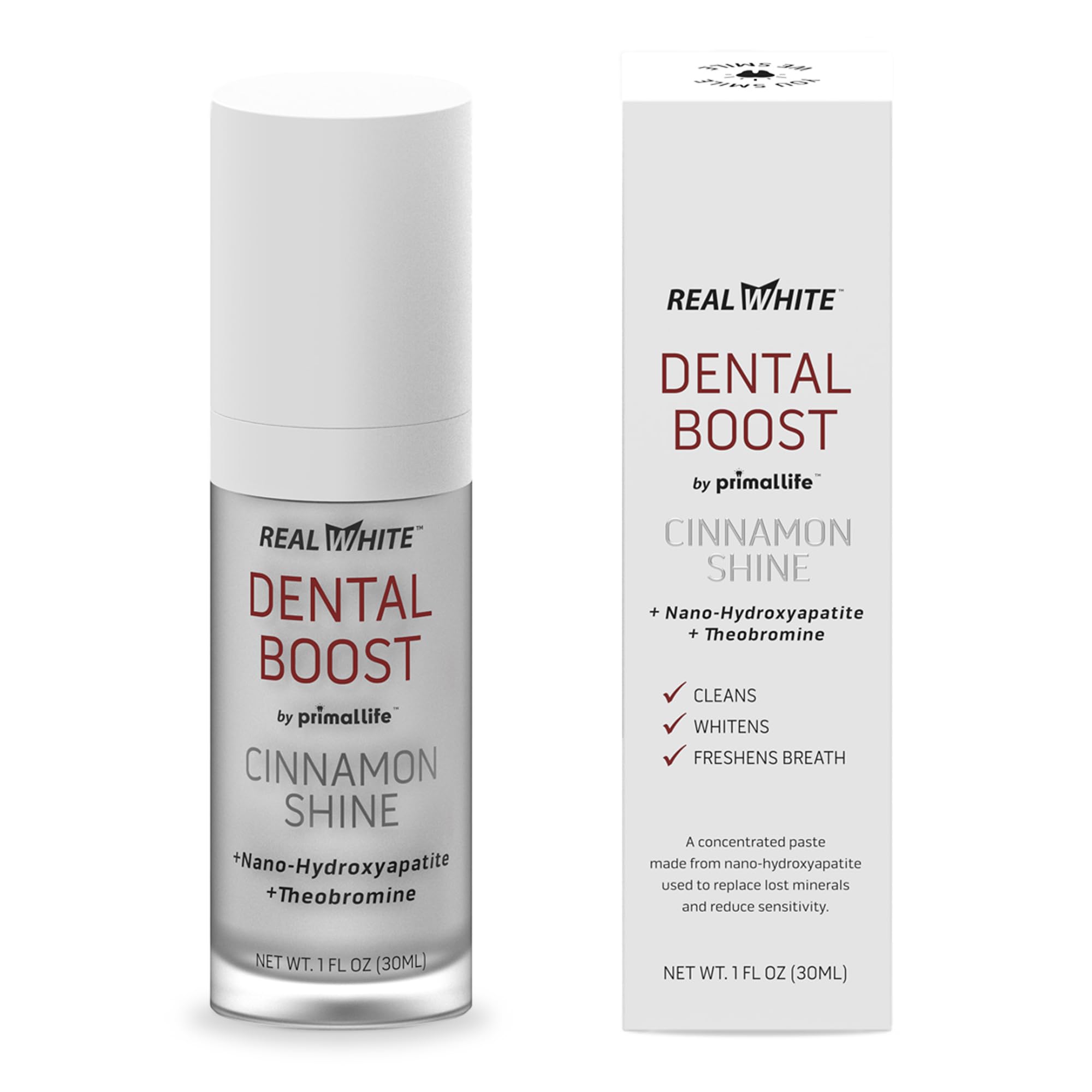 RESPONSIBLE PACKAGING: Dental Boost teeth whitener is good for your teeth and for the planet. Our environmentally conscious packaging features a recyclable sugarcane pump bottle. EASY TO USE: Use it during or after brushing, as a midday touch-up, or anytime your mouth needs a reset. You only need 2 minutes. Rub two pumps on teeth with a soft brush or your finger until all teeth are covered. Allow to sit on your teeth for 2 minutes. Spit and repeat. HEALTHY ALTERNATIVE TO FLUORIDE: The combination of nano-hydroxyapatite and theobromine rebuilds enamel and stimulates more acid-resistant crystals, rivaling the protection of fluoride without the risk. TEETH WHITENER AND MORE: Ingredients deliver benefits for overall oral health: strengthens teeth, promotes healthy gums, freshens breath, and reduces sensitivity. Infused with cinnamon essential oil, this formula brings a cozy spice to your smile—and a powerful new layer of protection for your teeth and gums. ALL-NATURAL: Our Dental Boost whitening paste is organic, gluten free, paleo and vegan, with theobromine, nano-hydroxyapatite and other natural ingredients that help rebuild enamel and make your smiler brighter than ever. No damaging bleach or peroxide!.