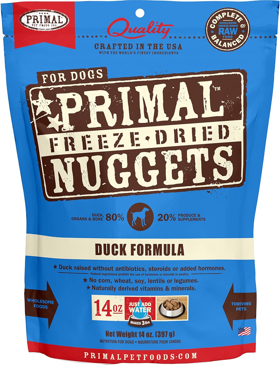 Primal Pet Foods Raw Dog Food Nuggets Complete & Balanced Meal Use as Topper or Treat - Premium - Healthy - Grain Free - High Protein Raw Dog Food, 14 oz - Duck Flavor