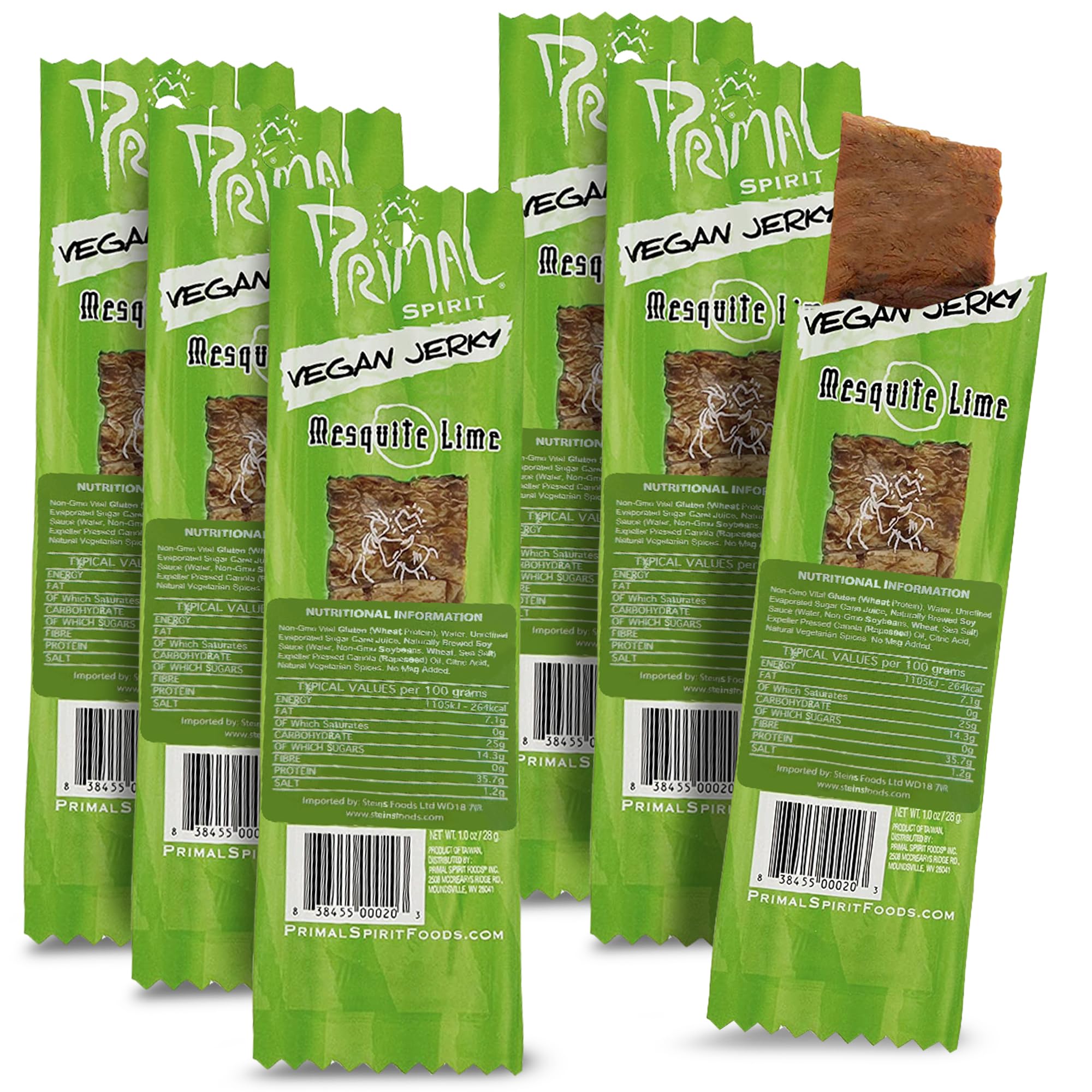 Voted Best Vegetarian Snack by VegNews Our Primal Strips are also a favorite among protein-hungry cyclists, climbers, and outdoor enthusiasts. Look beyond snacking and try slicing them into salads, tossing them in fries and burritos, or even serving them in hot sandwiches. Kids love them in their lunchboxes and as mid-day snacks. Primal Strips are delicious, healthy, and meat-free snacks that offer the health benefits of soy, seitan, and shiitake mushrooms, all with meat-like satisfaction. Primal Strips: the best taste, the best texture, meat-free at the lowest price on the market. Non-GMO All Natural Certified Vegan Cholesterol-free No artificial preservatives or colors High Energy - High Protein Soy, Seitan, and Shiitake MushroomsPrimal Spirit, Bandelettes végétaliennes sans viande – Haute énergie, riche en protéines, sans OGM, 93 de collations sans graisse, végétalien Jerky – 28 g, lot de 1 saveur citron vert MesquiteDESCRIPTION DU PRODUIT Élu meilleure collation végétarienne par VegNews Nos bandes Primal Strip sont également les favoris des cyclistes affamés de protéines, des grimpeurs et des personnes en plein air. Regardez au-delà de la collation et essayez de les couper en salades, sauter des frites et des burritos, ou même servir des sandwichs chauds. Les enfants les adorent dans leurs boîtes à déjeuner et comme collations de mi-journée. Les bandelettes Primal sont des collations délicieuses, saines et alternatives à la viande offrant les bienfaits positifs pour la santé des champignons de soja, de seitan et de shiitake, le tout avec une satisfaction viande. Primal Strips, le meilleur goût, le meilleur texturé, sans viande au prix unique le plus bas du marché. Sans OGM Entièrement naturel Certifié végétalien Sans cholestérol Sans conservateurs ni colorants artificiels Haute énergie - Haute teneur en protéines Champignons de soja, seitan et shiitake