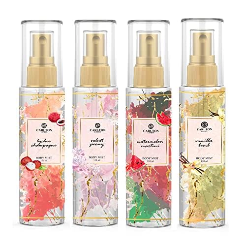 prime craft Carlton London Body Mist Combo Pack - Vanilla Bomb - Watermelon Martini - Velvet Peony - Lychee Champagne Body Mist Set of 4-150 ml Each | Fruity Fragrance