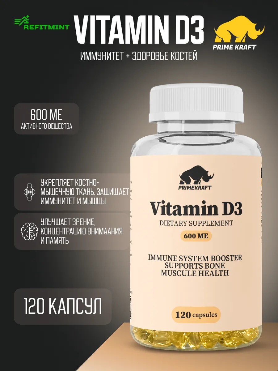 Витамин D3 (холекальциферол) - "солнечный" витамин, необходимый для здоровья костей, суставов, а также иммунной, сердечно-сосудистой, эндокринной, гормональной, нервной систем**Преимущества витамина D3 от Prime Kraft:**- масляная основа обеспечивает эффективное усвоение витамина D3- одна капсула содержит суточную дозу витамина D3 (600 МЕ) рекомендованную для взрослого человека- компактная баночка, которую легко и удобно носить с собой- выгодная цена**Для чего используется?**- для профилактики рахита и остеопороза- для регуляции обмена веществ- для компенсации дефицита солнечных лучей в "облачных" регионах, а также в холодное время года- для поддержания женского репродуктивного здоровья и восстановления после беременности**Применяется для компенсации дефицита витамина D, вызванного недостатком солнца, беременностью и грудным вскармливанием, диетами и несбалансированным (в том числе вегетарианским) питанием.**Взрослым по 1 табл. 1 раз в день во время еды. Продолжительность приема 1 месяц
