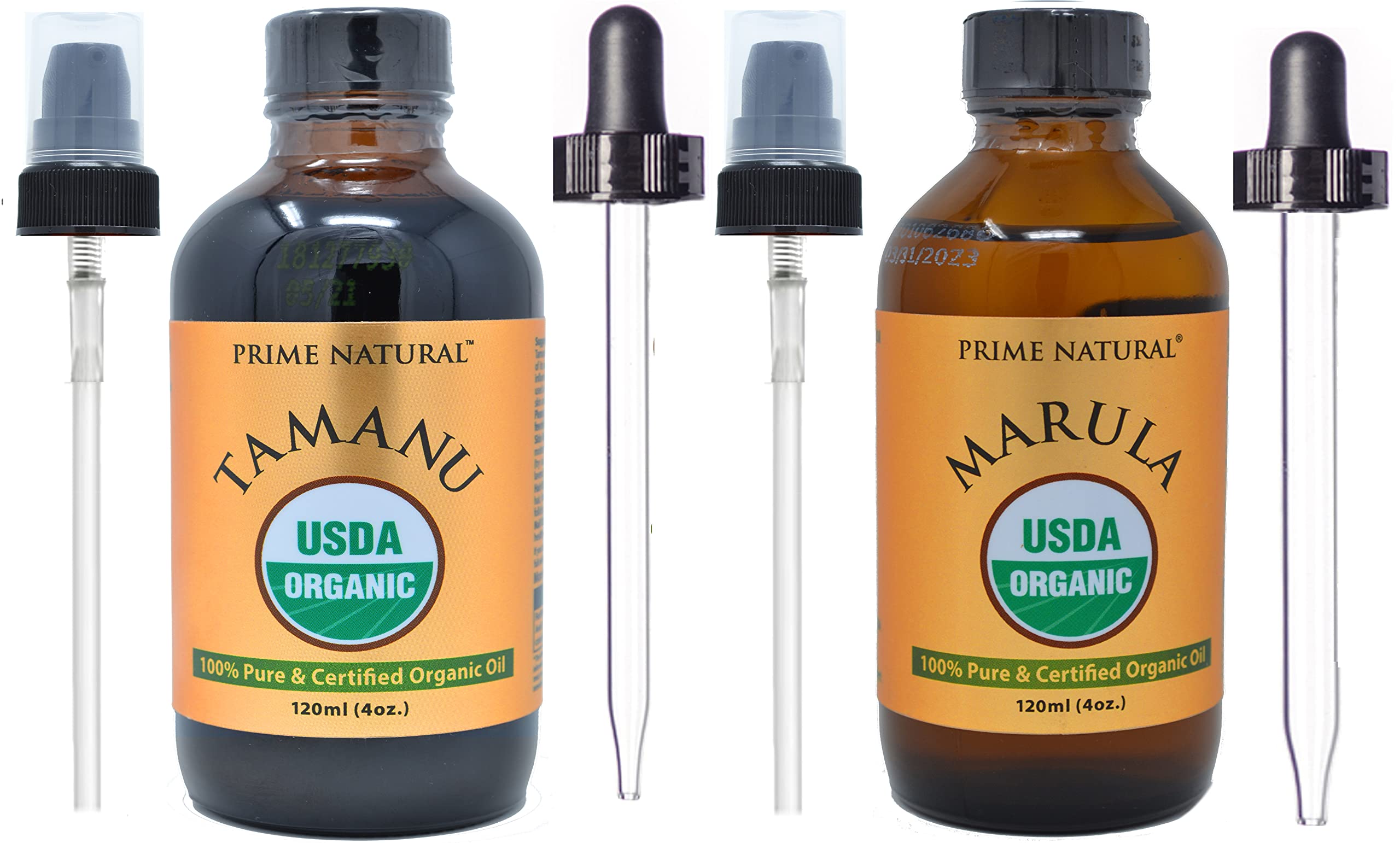 PRIME NATURAL Organic Tamanu Oil (4oz) & Organic Marula Oil (4oz) Bundle - USDA Certified - Cold Pressed Virgin Unrefined Vegan For Face Hair & Skin Care - Natural Moisturizer