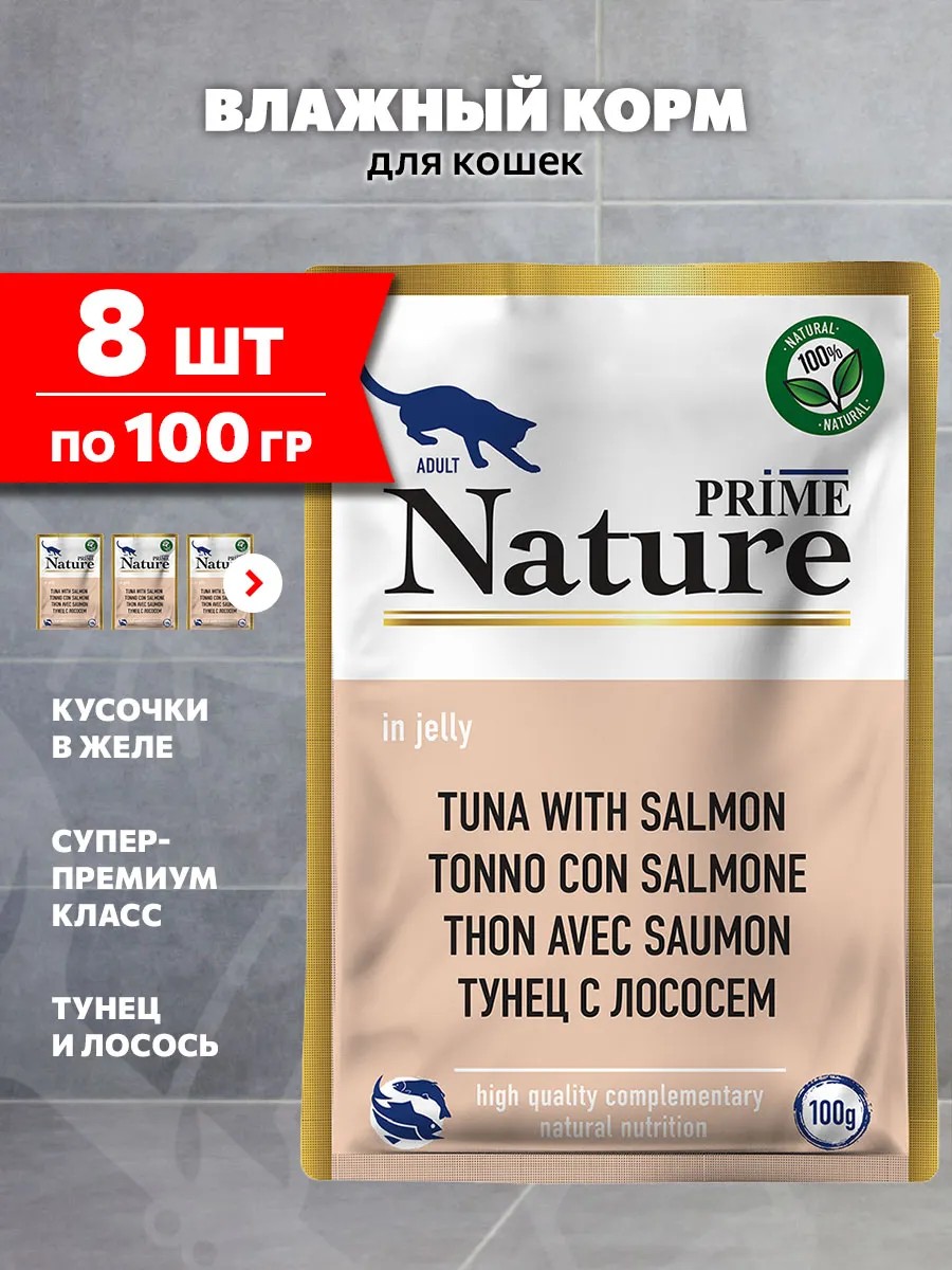 Prime Nature Корм для кошек влажный тунец лосось в желе 100 г 8 шт