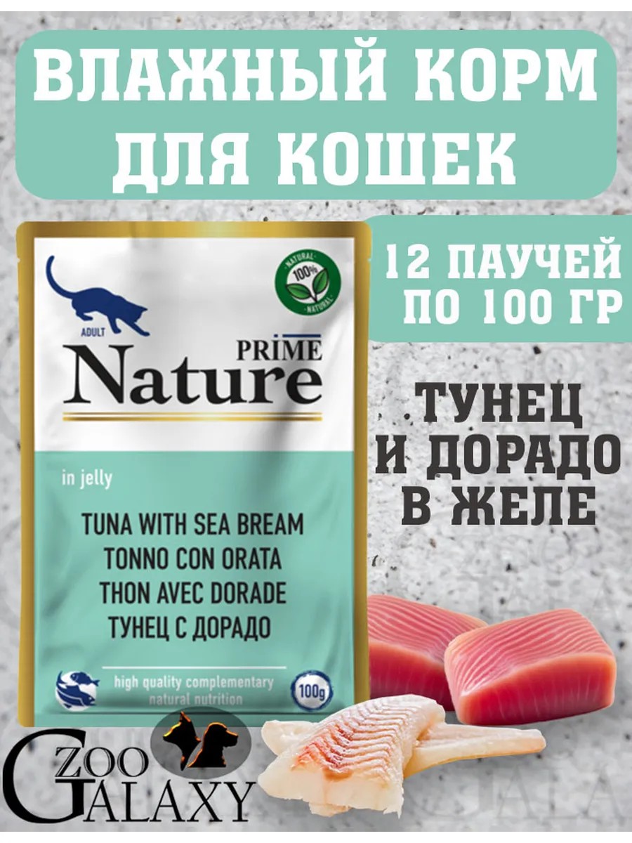Prime Nature Корм NATURE для кошек паучи Тунец и дорадо в желе 12х100г