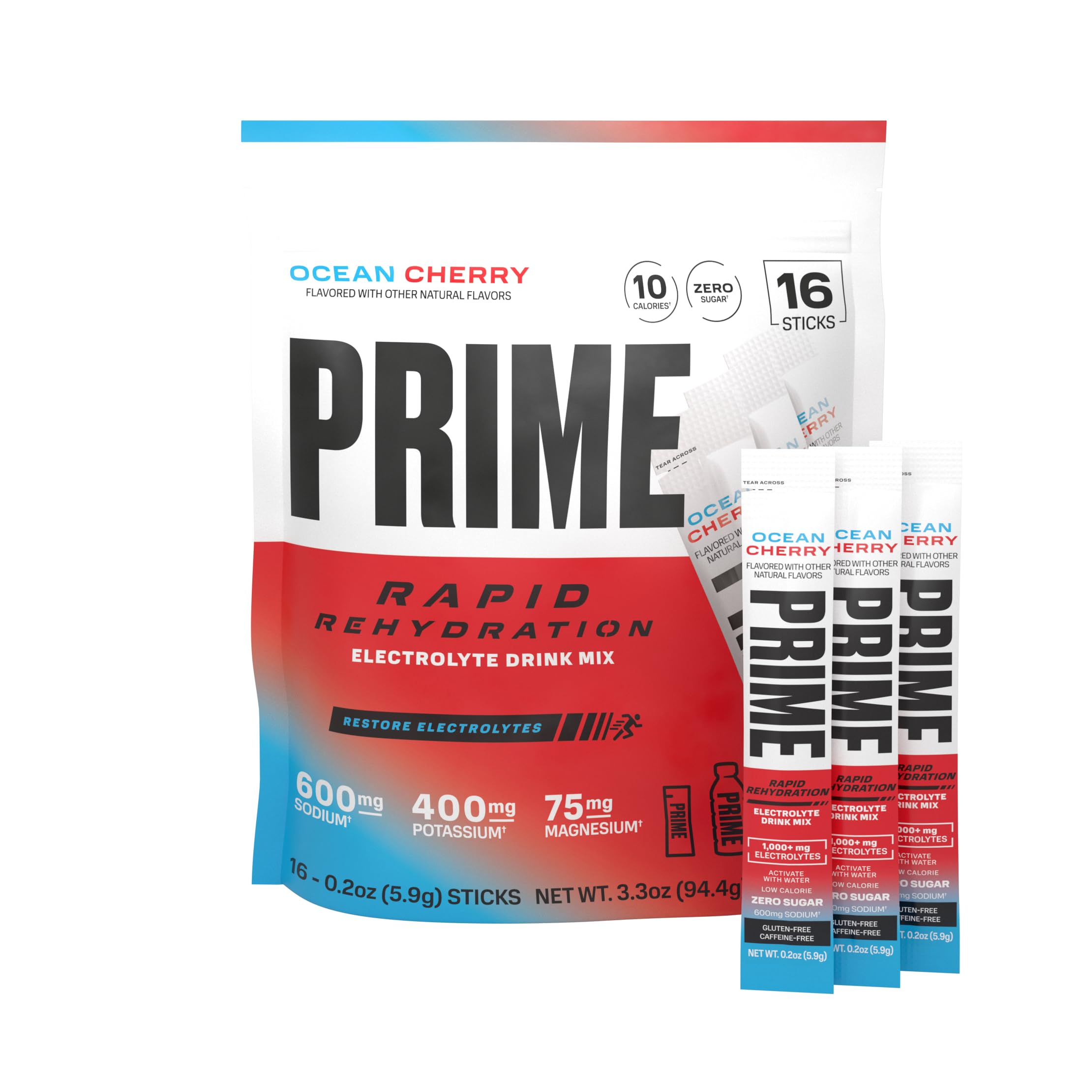 Founded by social media superstars and entrepreneurs Logan Paul and KSI, PRIME is a better-for-you beverage brand focused on providing fuel for any lifestyle or endeavor. PRIME was developed to fill the void where great taste meets function, with bold flavors and functional formulas to help you refresh, replenish and refuel. Rapid Rehydration anytime, anywhere. PRIME Rapid Rehydration Sticks deliver hydration on demand with an electrolyte-enhanced formula for every athlete, go-getter or hydration-seeker. They are packed with 1,085mg of electrolytes, zero sugar, and only 10 calories to help support fluid balance, muscle function, and nerve signaling to keep you performing at your best. Hydration Callouts: Zero Sugar 10 Calories 1,085mg Electrolytes B Vitamins Minerals Caffeine-Free No Artificial Sweeteners or Dyes Rapid Hydration AnywhereON THE GO HYDRATION: Lightweight and travel-ready, PRIME Rapid Rehydration Sticks are perfect for gym bags, travel days, late nights, or anytime you need instant hydration. Just open, pour, shake, and drink. ICONIC FLAVORS, LEGENDARY RECOVERY: With bold, all-natural flavors, PRIME delivers a thirst-quenching boost that turns every flavor into a staple in your beverage rotation. Ocean Cherry surges smooth cherry with crisp refreshment for a wave of cool-down. NO ARTIFICIAL COLORS OR FLAVORS: PRIME Rapid Rehydration Sticks are naturally flavored, gluten-free, caffeine-free, and contain no artificial colors or sugars, delivering clean and effective hydration whenever you need it. 1,085MG OF TOTAL ELECTROLYTES: Each serving includes 600mg of sodium, 400mg of potassium, 75mg of magnesium, and 10mg of calcium to help replenish fluid balance and support muscle function, nerve signaling, and post-exercise hydration, plus high-potency B vitamins (B3, B5, B6, B12) and vitamin C to support energy, metabolism, immune function, and overall wellness. ZERO SUGAR HYDRATION: PRIME Rapid Rehydration Sticks contain 0g of sugar and just 10 calories per serving. Each stick mixes with 16 fl oz of water and is ideal for use in the morning, during workouts, or while traveling.