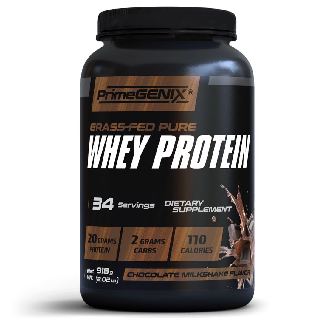 Fuel your performance and elevate your daily nutrition with the clean power of PrimeGENIX Grass-Fed Whey Protein. Each serving delivers 20g of high-quality protein made from pure, grass-fed milk to support lean muscle, strength, and daily recovery. With just 110 calories and zero added sugar, this natural protein powder provides a pure source of nutrition that fits perfectly into your healthy, active lifestyle. Each scoop is crafted with care to help you perform at your best, whether you're powering through workouts or maintaining daily wellness goals. Our triple-pure microfiltration process gently removes unwanted fat, sugar, and carbs while keeping essential nutrients intact. This ensures maximum purity, faster absorption, and easy digestion so your body gets the most from every serving. Each container provides 34 servings of PrimeGENIX zero added sugar whey protein powder that mix easily with water or milk, creating a rich, creamy protein chocolate shake that tastes indulgent yet stays clean and simple, no clumps, no chalky texture, just smooth, satisfying flavor you'll actually enjoy. Made with clean, natural ingredients and absolutely no artificial fillers, PrimeGENIX healthy protein powder is Non-GMO and crafted under strict quality standards for consistent purity and dependable performance. Each serving provides sustained nourishment and balanced energy to support muscle recovery, active performance, and your long-term fitness goals. Whether you need a quick post-workout shake, a breakfast smoothie, or a light meal replacement, this grass fed protein powder offers a convenient and delicious way to stay strong, fueled, and focused every day.PURE QUALITY YOU CAN TRUST - Made with clean, natural ingredients and no artificial fillers. Non-GMO and crafted under strict quality standards to ensure every scoop delivers consistent purity, great taste, and dependable protein nutrition that supports your active lifestyle and long-term fitness goals. FUEL YOUR BODY ANYTIME, ANYWHERE - PrimeGENIX protein shake powder is ideal for pre- or post-workout shakes, breakfast smoothies, or a quick on-the-go protein boost. Each serving of pure protein powder provides clean energy and sustained nourishment to support lean muscle recovery, active performance, and your balanced nutrition goals. DELICIOUSLY SMOOTH CHOCOLATE FLAVOR - Experience rich, creamy chocolate whey protein powder that mixes instantly with water or milk. No clumps or chalky texture, just silky-smooth consistency and indulgent flavor that makes hitting your protein goals easy, enjoyable, and delicious, perfect for supporting your daily wellness routine. TRIPLE-PURE MICROFILTRATION PROCESS - PrimeGENIX zero added sugar protein powder goes through a triple-pure microfiltration process that gently removes unwanted fat, sugar, and carbs while keeping essential nutrients intact, offering maximum purity, faster absorption, and easy digestion for superior natural protein results every time. 20G CLEAN GRASS-FED PROTEIN PER SERVING - Each scoop delivers 20g of high-quality whey protein supplement sourced from pure, grass-fed milk, with just 110 calories and zero added sugar. Additionally it is loaded with a full spectrum of BCAA's Amino Acids, to support muscle growth. Enjoy a clean, pure protein source that fuels muscle strength and recovery without extra carbs or fat.