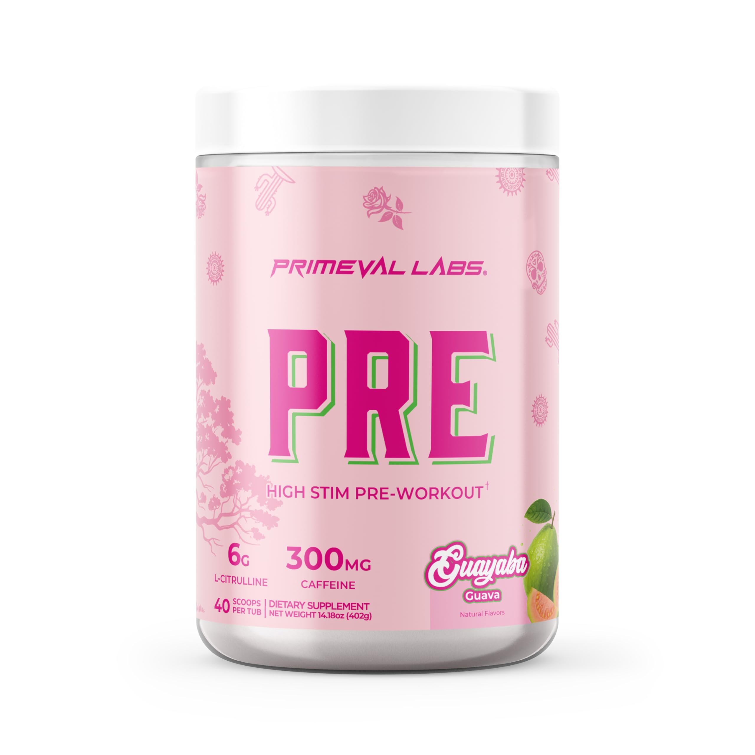 Primeval Labs PRE – High-Stim Energy for Peak Performance Take your workouts to the next level with Primeval Labs PRE, a powerful pre-workout designed to maximize energy, focus, endurance, and muscle performance. Formulated with research-backed ingredients and a total of 300mg caffeine per 2 scoops, this pre-workout supplement helps you crush your training goals with sustained intensity. Whether you're hitting legs, chg PRs, or need to push through fatigue, PRE delivers with: 6g L-Citrulline for pumps and blood flow 3.2g Beta Alanine for muscular endurance CognatiQ Theobromine for clean mental energy Taurine Betaine Anhydrous for performance and hydration Huperzine A for laser-sharp focus This Guava-flavored powder mixes easily, tastes great, and comes in a 40 serving tub perfect for daily trainers and serious athletes alike. Use 1 scoop for moderate energy or 2 scoops for the full strength experience.CRAFTED WITH AUTHENTICITY AND PURPOSE: At Primeval Labs, we blend cultural pride with performance innovation. Our pre workout packets and full-size tubs offer authentic flavor, clean formulation, and convenience for daily use. Bring home the Primeval Labs protein powder experience—where culture meets power, and flavor fuels your journey. LATINO-INSPIRED FLAVORS THAT CELEBRATE CULTURE: Experience Primeval Labs supplements in flavors inspired by Latin America—Guayaba, Jamaica, Mangonada, Melon, Pepino Limón, and Tamarindo. Each flavor honors our heritage while redefining sports nutrition with taste that inspires every rep. CLEAN, CONTROLLED ENERGY WITHOUT THE CRASH: This strong pre workout features a balanced blend of stimulants for smooth, steady energy and clear mental performance—without jitters or sudden fatigue. Perfect for those who want high caffeine pre workout power and consistency in every session. RESEARCH-SUPPORTED INGREDIENTS FOR REAL RESULTS: Each serving combines 6g L-Citrulline for pumps and blood flow, 3.2g Beta Alanine for endurance, Taurine and Betaine Anhydrous for hydration, plus Huperzine A and CognatiQ for cognitive clarity. Every scoop of Primeval Labs pre workout is crafted with research-supported ingredients to help you stay focused and strong. SUSTAINED ENERGY AND FOCUS FOR PEAK PERFORMANCE: Formulated with 300mg caffeine from Caffeine Anhydrous and Infinergy, Primeval Labs PRE High-Stim Pre Workout delivers long-lasting energy, and laser-sharp focus to power your most intense workouts. Ideal for athletes seeking a high stim preworkout for men that keeps them driven through every set.