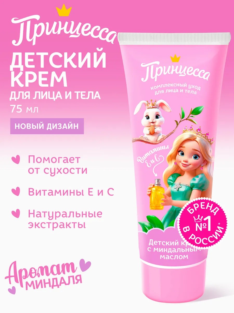 Little hands, elbows, and heels will be softer than ever with almond cream from Princess! Apply baby cream with almond oil to any area of the body after bathing or just to dry areas. Thanks to allantoin and vitamin E, it renews the epidermis and accelerates the healing of cuts and scratches. Almond oil leaves the skin soft, nourished, and hydrated. Thanks to its delicate texture, the cream is quickly absorbed without leaving a greasy residue. The enchanting sweet scent of almond cake will surely delight all little beauties and their mothers, providing the best care and a wonderful mood! Almond oil nourishes, moisturizes, softens, and has an anti-inflammatory and soothing effect. Allantoin actively and deeply moisturizes, literally revitalizing the skin. Vitamins C and E provide protection and hydration. The cream's formula is adapted to the needs of baby skin and is free of parabens, synthetic oils, and silicones. The cream is suitable for dry and sensitive skin, as well as the face. HOW TO USE: Apply to skin with light massage movements.