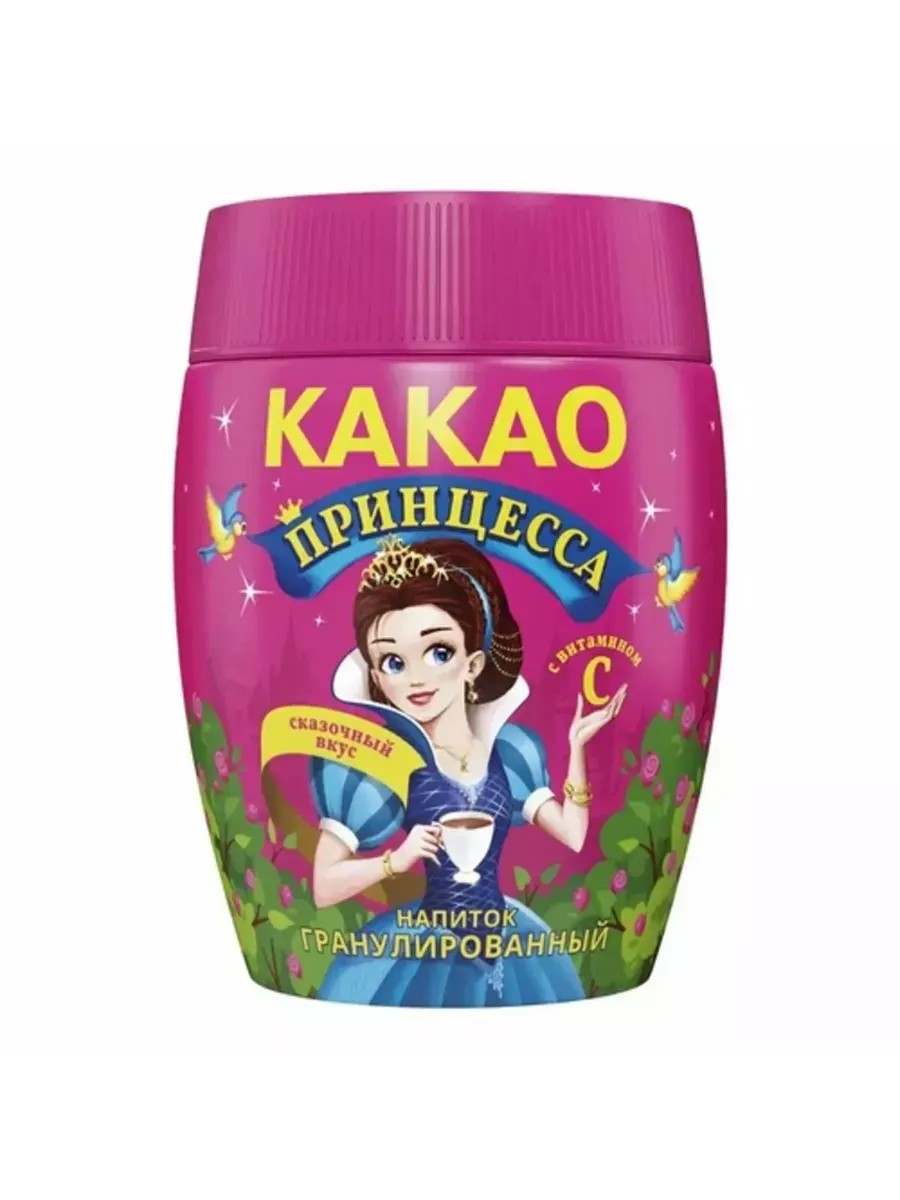 Принцесса, какао гранулированное Принцесса, 300 грамм. Натуральное с содержанием витамина C - это отличный напиток на завтрак для детей и не только! Способ приготовления: 3-4 чайных ложки насыпать в кружку, залить кипятком или горячим молоком, перемешать.