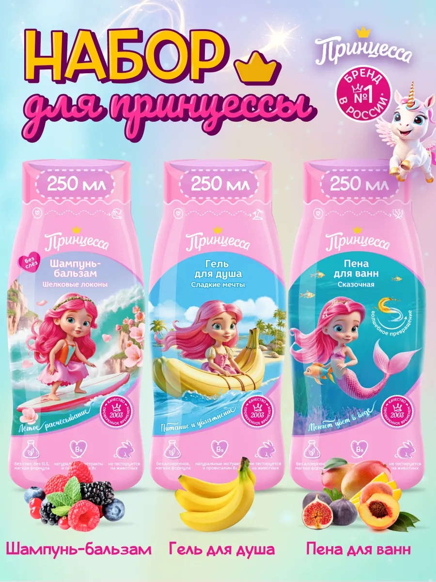 Принцесса Шампунь и Гель для душа и Пена для ванн, 3х250 мл
