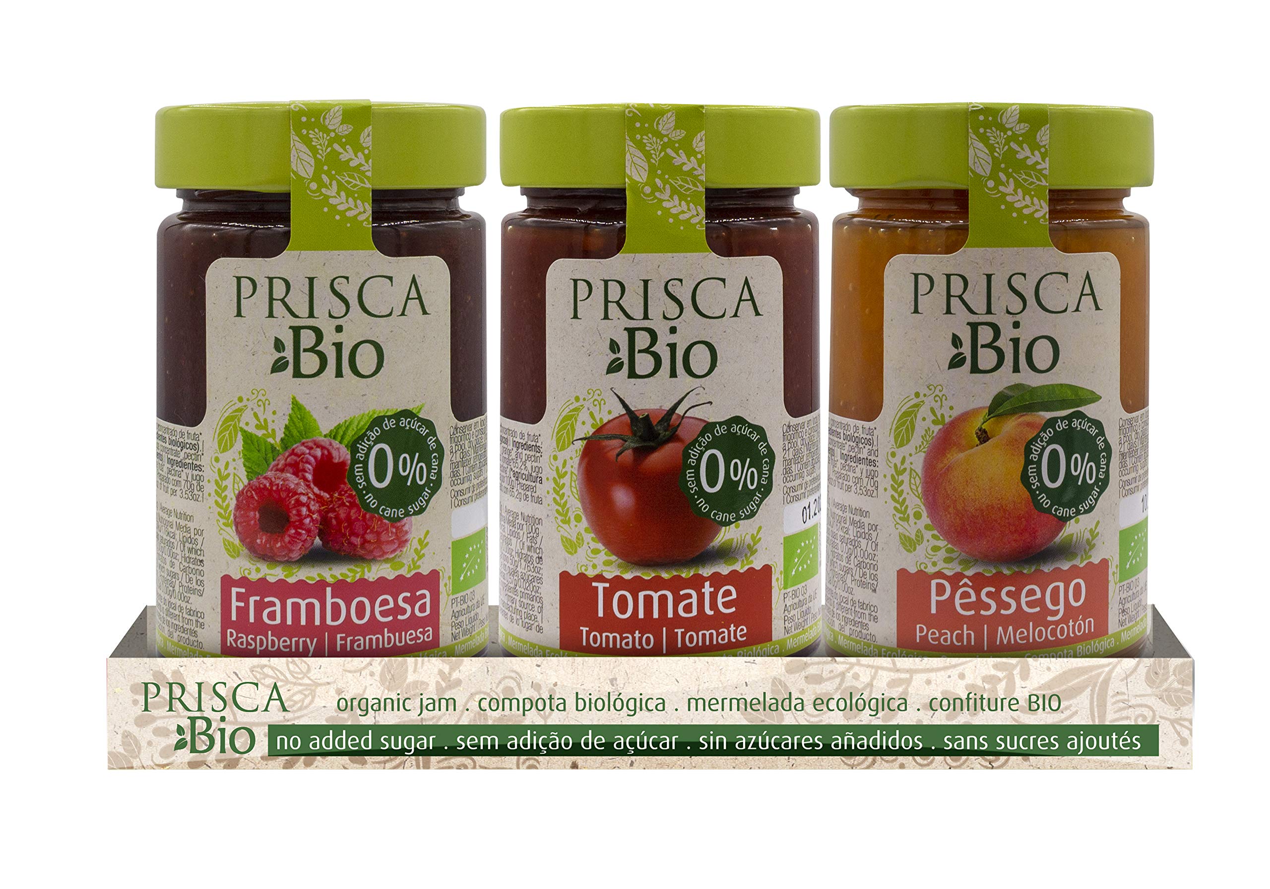 PRISCA 100% Organic Raspberry Jams - Tomato - Peach - No Sugar Added - Certified Organic Product - Packaging of 3 units of 240 GR each