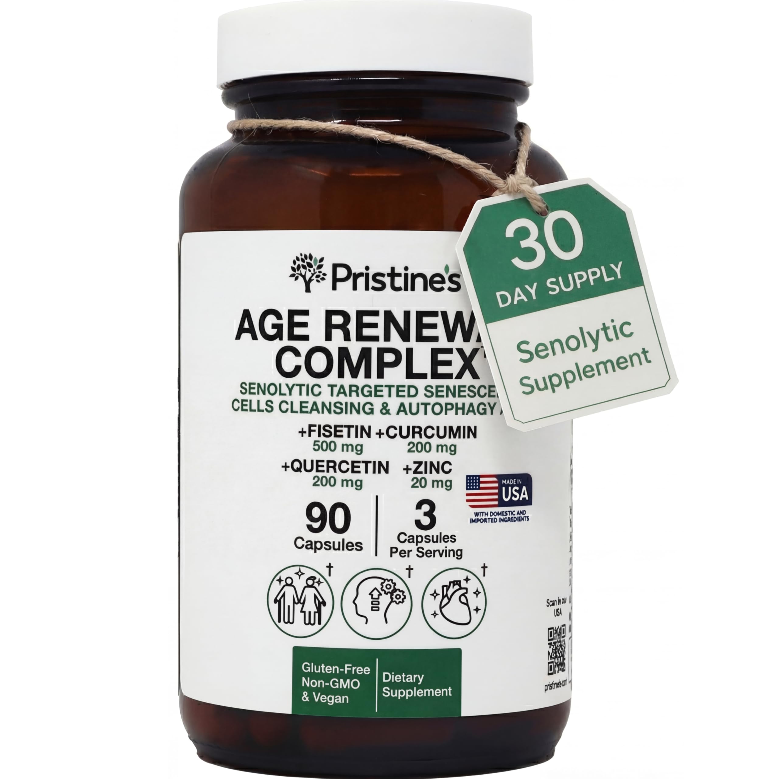 PRISTINE'S Senolytic Anti Aging & Autophagy Aid Age Renewal Complex - Senescent Cell Removal Support - Fisetin Quercetin Curcumin Zinc - Gluten Free Non-GMO Vegan USA Made 1