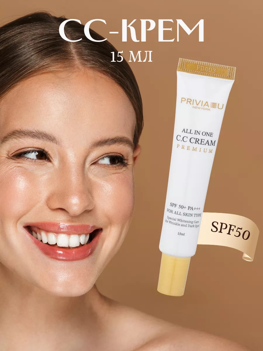 Introducing the travel-size All In One CC Cream PREMIUM SPF 50+ PA+++ from the Korean cosmetics manufacturer PRIVIA. This Korean foundation features an improved formula and a convenient 15 ml volume that fits in your makeup bag. The updated PRIVIA CC cream features a universal beige shade that adapts to your light or medium skin tone and creates a lightweight, even coverage that conceals imperfections, including age spots and redness. Privia CC cream gives skin a fresh, natural, radiant beauty, providing both care and makeup in one package. SPF 50 protects against UVA and UVB sunscreen, preventing premature aging, pigmentation, flaking, and redness. The Oriental Beauty Fruits Newplex complex of plant extracts includes pomegranate, fig, mulberry, and ginkgo biloba, which moisturizes and improves skin texture, restoring elasticity and firmness. Tranexamic acid helps whiten age spots, reduce redness, and leave skin radiant. Thanks to its formula based on Korean ingredients, Privia CC Cream has an anti-aging effect and promotes skin cell regeneration. All together, it provides a hydrating, brightening, and anti-aging effect for your skin. Privia foundation combines the properties of a moisturizer, foundation, and sunscreen. It contains natural ingredients and plant extracts such as yarrow, centella asiatica, baical skullcap, chamomile, arnica, rosemary, aloe, hydrolyzed collagen, snail mucin, adenosine, and arbutin. Spring is a challenging time for skin. It's still heated indoors, causing dry air; outside, it's cool, and temperature changes significantly worsen skin condition. If you have the opportunity to moisturize your skin, use it. Suitable for travel and daily use. The small sample size is a good opportunity to try the product before purchasing the full-size version.
