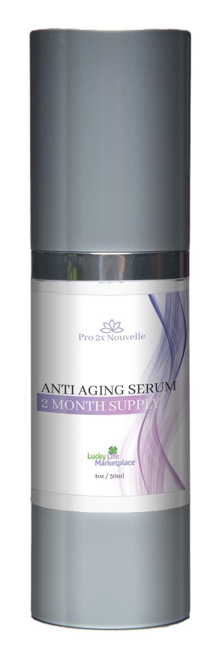 Pro 2x Nouvelle Anti Aging Serum is designed to help minimize and prevent the signs of aging. Each bottle contains a 2 month supply of a potent yet soothing blend of anti-aging ingredients that help bring out a youthful looking energized radiant glow to your skin. As your skin quickly absorbs our best anti-aging serum you will begin to feel the age defying ingredients produce results. The advanced anti aging formula contains alpha hydroxy acids, Lactic Acid & Citric Acid, to help exfoliate, resurface, and promote blood flow to the skin. Exfoliation supports the skin cell regeneration, even skin tone, and increased product absorption to maximize results. Alpha hydroxy acids also aid in skin firming and tightening to help visibly reduce the appearance of wrinkles, fine lines, crow’s feet, and loose saggy skin. Our best anti aging serum also contains Vitamin C and Vitamin E to help soften skin, reduce puffiness, and improve skin discolorations including dark spots, age spots, dark circles, and sun spots. This anti aging facial serum supports deep lasting hydration with Aloe Vera and helps soothe skin with Chamomile Extract. The combined ingredients in the rejuvenating serum support increased collagen production to help strengthen skin, improve elasticity, restore firmness, and boost hydration. Pro 2x Nouvelle Anti Aging Serum 2 Month Supply is both an anti aging face serum and an anti aging eye serum. It can be used day and night for all your anti-aging skin care needs. Get your bottle today and SEE the benefits a quality anti-aging serum can have on your appearance.MADE IN THE USA WITH DERMATOLOGIST RECOMMENDED ANTI AGING INGREDIENTS. HELP REDUCE THE APPEARANCE OF SURFACE WRINKLES, FINE LINES, DARK CIRCLES, REDNESS, HYPERPIGMENTATION, & PORE SIZE. HELP SOFTEN AND SMOOTH SKIN AND IMPROVE OVERALL TEXTURE FOR A YOUNGER LOOKING COMPLEXION. PROMOTE SKIN CELL TURNOVER AND RENEWAL WITH EXFOLIATING LACTIC ACID. DAILY ANTI AGING SERUM - 2 MONTH SUPPLY - PARABEN-FREE, DYE-FREE, FRAGRANCE-FREE, CRUELTY FREE.