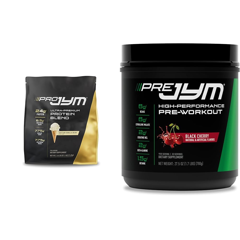 PRO JYM 45 Servings - Tahitian Vanilla Bean About the Pro JYM protein powder supported goals: muscle - growth - strength what it is: the perfect blend of three of the most effective types of proteins for building muscle: whey, micellar casein, and Egg protein. The three types of protein are absorbed in the body at varying rates of speed – Whey extremely fast, Casein very slowly, and egg at a "medium" pace. This is exactly how you want your protein to act both before and after workouts to ensure that the muscles get an immediate supply of amino acids (The building blocks of protein) as well as a steady trickle of them in the hours following research now suggests that when you add medium-digesting and slow-digesting proteins to fast-digesting whey, muscle protein synthesis remains elevated for longer than when using whey alone. And muscle protein retention is higher, as well. That means that more protein is being built in the muscle. That is what may help lead to long-term gains in Muscle growth and strength. each serving of Pro JYM provides 24 grams protein: 7.5g Whey protein isolate 7g micellar casein 7g milk protein isolate 2.5g egg white protein what sets It apart: aside from being a protein blend in a crowded market of sometimes under per forming 100 whey protein powders, Pro Jim is also a non-proprietary blend. A proprietary blend is any supplement that doesn't list the precise amount of every single active ingredient it contains. This isn't just prevalent with pre-workouts and fat-burners – a lot of protein powders on the market are proprietary blends because they don't tell you the exact amounts of the proteins in the formula. Pro JYM, on the other hand, lists the exact amounts on the front of the container of all three types of proteins in their four distinct forms: whey protein isolate (7.5 grams), micellar casein (7 grams), egg albumen (2.5 grams) and milk protein isolate (7 grams – 5.5 grams casein, 1.5 grams whey). nitrogen spiking (aka "amino spiking" or "protein spiking") is an unscrupulous technique where some supplement companies put in less protein than what's listed on the label as a means of slashing costs and increg their protein margins – At the user's expense. Getting a "spiked" protein means paying for, say, 24 grams of protein but getting only 18 grams of actual whole proteins. With Pro JYM, you get all 24 grams. Pro Jim is not and never will be spiked with cheap fillers. PRE JYM 30 Servings - Black Cherry Pre JYM Pre Workout Powder - BCAAs, Creatine HCI, Alpha-GPC, Beet Root, Citrulline Malate, Beta-Alanine, Betaine, Huperzine, and More JYM Supplement Science Black Cherry, 30 ServingsProduct 2: Enhanced strength endurance- Creatine HCl, beta-alanine and Betaine help fuel your muscles for more strength and stamina during workouts. The BCAAs (branched-chain amino acids) found in pre JYM provide a direct source of energy during your workout. Product 2: Great taste - no other pre-workout supplement surpasses the great taste, texture, and nutrition of pre JYM. Simply mix with 12-32 ounces of water and drink 30 minutes before your workout for the best results. Product 2: Product Note: Exposure to heat or sunlight may lead to melting damage of product. Hence customers are expected to be available during the product delivery. Product 2: Quality ingredients - pre JYM pre-workout powder contains the best ingredients to optimize your workout. It has bccaa's and Creatine for muscle growth, Citrulline Malate and caffeine for endurance, plus beta-alanine and Betaine for strength. Product 1: NO SPIKING - Pro JYM does not include cheap amino acids that can lead to protein Spiking. Each serving contains 24 grams of whole proteins, it is optimal for lean muscle growth, as a higher percentage of calories are derived from the protein. Product 1: PERFECT RATIO - Pro JYM contains the ideal ratio of the three optimum proteins for building muscle: 50 casein, 40 whey and 10 egg protein. For both men women, This blend supports your natural strength, energy, endurance recovery. Product 1: GREAT TASTE - No other protein powder surpasses the great taste, texture, and nutrition of Pro JYM. Simply mix with water, milk, almond milk or add other Ingredients For a delicious high protein shake or smoothie. It also comes in chocolate. Product 1: ISOLATE BLEND - Scientific studies have shown that a blend is considerably better for maximizing muscle-building than standard whey protein Alone, This blend contains whey protein isolate, micellar casein, milk protein isolate, and egg white protein.