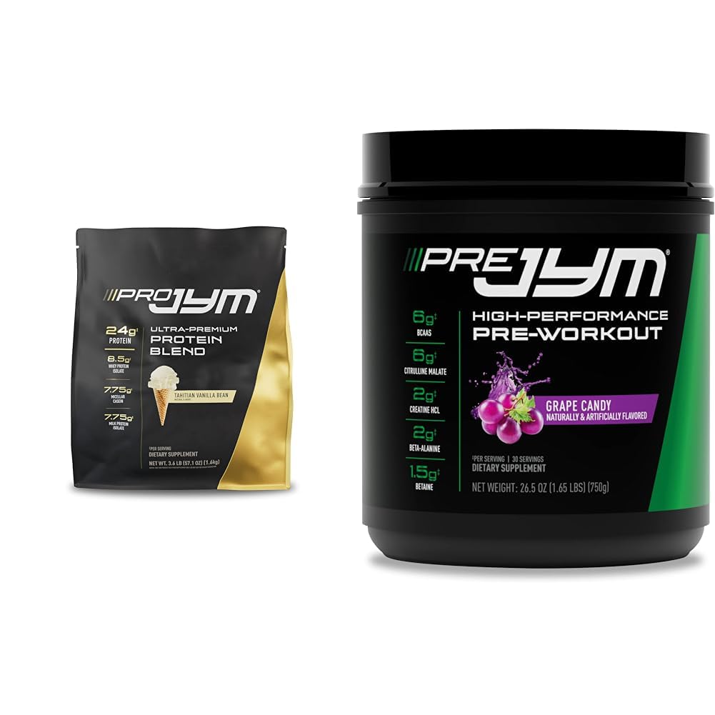 PRO JYM 45 Servings - Tahitian Vanilla Bean About the Pro JYM protein powder supported goals: muscle - growth - strength what it is: the perfect blend of three of the most effective types of proteins for building muscle: whey, micellar casein, and Egg protein. The three types of protein are absorbed in the body at varying rates of speed – Whey extremely fast, Casein very slowly, and egg at a "medium" pace. This is exactly how you want your protein to act both before and after workouts to ensure that the muscles get an immediate supply of amino acids (The building blocks of protein) as well as a steady trickle of them in the hours following research now suggests that when you add medium-digesting and slow-digesting proteins to fast-digesting whey, muscle protein synthesis remains elevated for longer than when using whey alone. And muscle protein retention is higher, as well. That means that more protein is being built in the muscle. That is what may help lead to long-term gains in Muscle growth and strength. each serving of Pro JYM provides 24 grams protein: 7.5g Whey protein isolate 7g micellar casein 7g milk protein isolate 2.5g egg white protein what sets It apart: aside from being a protein blend in a crowded market of sometimes under per forming 100 whey protein powders, Pro Jim is also a non-proprietary blend. A proprietary blend is any supplement that doesn't list the precise amount of every single active ingredient it contains. This isn't just prevalent with pre-workouts and fat-burners – a lot of protein powders on the market are proprietary blends because they don't tell you the exact amounts of the proteins in the formula. Pro JYM, on the other hand, lists the exact amounts on the front of the container of all three types of proteins in their four distinct forms: whey protein isolate (7.5 grams), micellar casein (7 grams), egg albumen (2.5 grams) and milk protein isolate (7 grams – 5.5 grams casein, 1.5 grams whey). nitrogen spiking (aka "amino spiking" or "protein spiking") is an unscrupulous technique where some supplement companies put in less protein than what's listed on the label as a means of slashing costs and increg their protein margins – At the user's expense. Getting a "spiked" protein means paying for, say, 24 grams of protein but getting only 18 grams of actual whole proteins. With Pro JYM, you get all 24 grams. Pro Jim is not and never will be spiked with cheap fillers. Pre JYM Grape Candy Pre Workout Powder - BCAAs, Nootropics, Creatine HCI, Citrulline, Beta-Alanine, Betaine, Taurine, Huperzine JYM Supplement Science 30 Servings About the JYM Pre Workout Powder: Supported Goals: Muscle Growth - Strength - Energy - Endurance - Mind. What It Is: A precise blend of 13 ingredients that we have used for decades in the gym, to help enhance training performance and promote sustainable results. Pre JYM provides the "kick" during workouts that hard-training individuals desire without the use of heavy stimulants. Caffeine, one of the most widely studied performance-enhancing supplements in the world, is the only stimulant present in Pre JYM. Caffeine is now believed to not only help provide performance benefits but also support a host of health benefits as well. The other ingredients work to help support mental focus, muscular endurance, and strength. With Pre JYM, you'll experience lasting energy and a noticeable boost in performance during your hardest, longest training session, without any crash. What Sets It Apart: We provide full disclosure of the product's 13 ingredients - 15 if you consider the BCAAs as three separate amino acids. This is a departure from most pre-workouts that mask ingredients through "proprietary blends" (meaning you don't know exactly how much of each ingredient is in the product). Other products may only provide a few of the critical ingredients shown to truly help maximize performance and results. Just look at the 25-gram serving size Pre JYM scoop – it's way bigger than the typical 5-10-gram scoop of most other pre-workouts. It's literally impossible to put all the ingredients that we recommend to help optimize your workout in a serving as small as that.Product 2: Enhanced strength endurance- Creatine HCl, beta-alanine and Betaine help fuel your muscles for more strength and stamina during workouts. The BCAAs (branched-chain amino acids) found in pre JYM provide a direct source of energy during your workout. Product 2: Great taste - no other pre-workout supplement surpasses the great taste, texture, and nutrition of pre JYM. Simply mix with 12-32 ounces of water and drink 30 minutes before your workout for the best results. Product 2: Product Note: Exposure to heat or sunlight may lead to melting damage of product. Hence customers are expected to be available during the product delivery. Product 2: Quality ingredients - pre JYM pre-workout powder contains the best ingredients to optimize your workout. It has bccaa's and Creatine for muscle growth, Citrulline Malate and caffeine for endurance, plus beta-alanine and Betaine for strength. Product 1: NO SPIKING - Pro JYM does not include cheap amino acids that can lead to protein Spiking. Each serving contains 24 grams of whole proteins, it is optimal for lean muscle growth, as a higher percentage of calories are derived from the protein. Product 1: PERFECT RATIO - Pro JYM contains the ideal ratio of the three optimum proteins for building muscle: 50 casein, 40 whey and 10 egg protein. For both men women, This blend supports your natural strength, energy, endurance recovery. Product 1: GREAT TASTE - No other protein powder surpasses the great taste, texture, and nutrition of Pro JYM. Simply mix with water, milk, almond milk or add other Ingredients For a delicious high protein shake or smoothie. It also comes in chocolate. Product 1: ISOLATE BLEND - Scientific studies have shown that a blend is considerably better for maximizing muscle-building than standard whey protein Alone, This ble