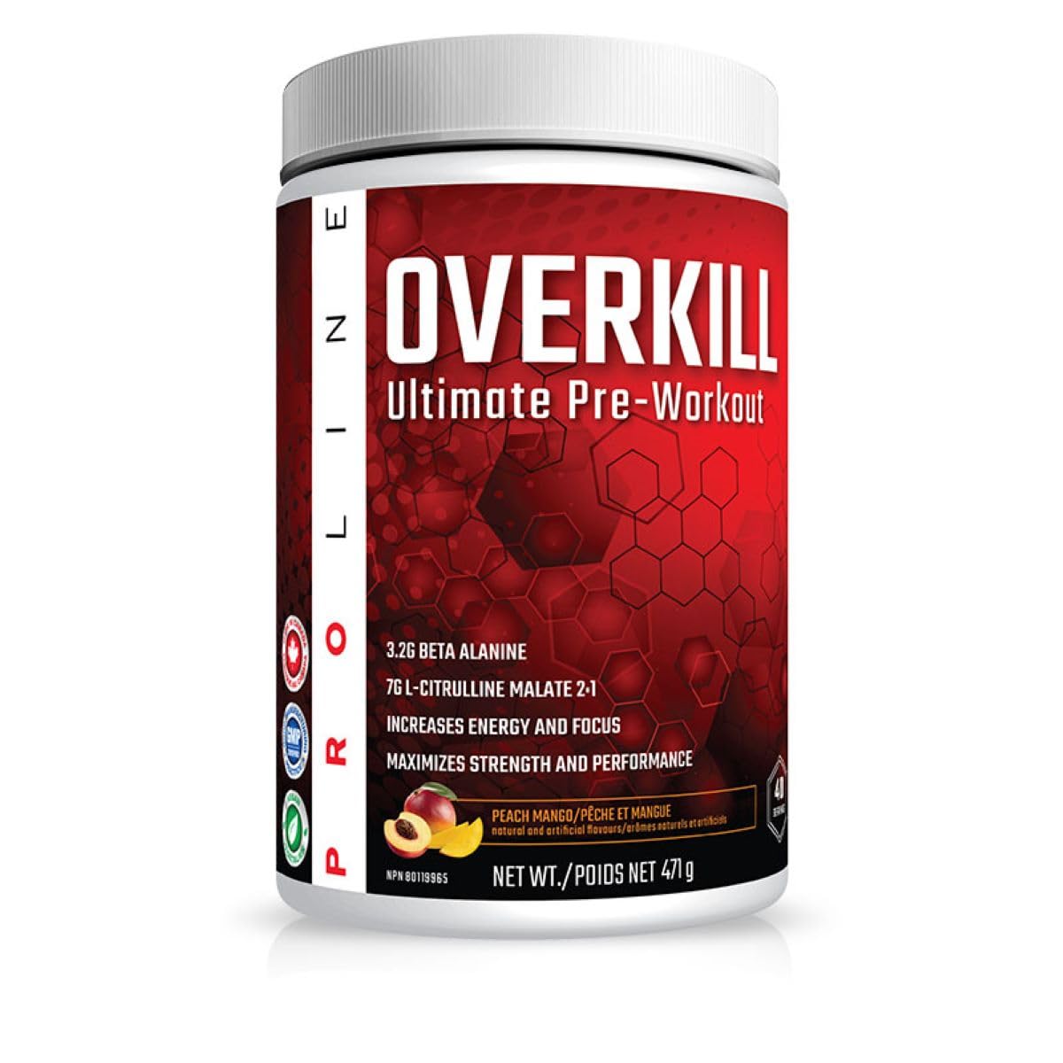 Pro Line Overkill Pre-Workout Powder is a high energy pre workout powder that features 88 active ingredients and a whooping 25.2g serving size per full scoop, making it one of the strongest pre-workouts in the industry today. Pro Line Overkill Pre-Workout was formulated using no fillers, binders, gums, or other pixie-dusted ingredients, Pro Line Overkill Pre-Workout works within minutes of taking your first serving, delivering explosive energy and mind-lock mental focus. With its transparent formula, Pro Line Overkill Pre-Workout is pulling back the curtain to show you exactly what goes into each of the products. Every one of Pro Line's scientifically based ingredients is at a an effective dose and disclosed to the milligram, even flavours and sweeteners are listed. Pro Line Overkill Pre-Workout Powder is a intense pre-workout powder that works to increase energy, provide laser sharp focus, maximize strength and performance, and provide boosted nitric oxide production leading to incredible muscle pumps. Pro Line Overkill Pre-Workout Powder features ingredients such as Citrulline Malate (2:1), Beta Alanine, Taurine, Glycine, and Agmatine Sulfate just to name a few. With each full serving of Pro Line Overkill Pre-Workout featuring 400mg of Caffeine, 7 grams of L-Citrulline Malate, 3.2 grams of Beta Alanine, and 200mg of L-Theanine, Pro Line Overkill Pre Workout is sure to provide increased energy, improved endurance, and intense muscle pumps, all while utilizing ingredients such as L-Theanine to minimize a crash. Pro Line Overkill is available in 4 delicious flavours Black Cherry Lime, Peach Mango, Electric Punch, and Raspberry Lemonade.TRANSPARENT LABEL: Pro Line Overkill Pre-Workout is pulling back the curtain to show you exactly what goes into each product. Each scientifically based ingredients is at a clinical dose and disclosed to the milligram, even flavours and sweeteners are listed. NITRIC OXIDE BOOSTER: With 7 Grams of L-Citrulline Malate per serving, Pro Line Overkill Pre-Workout delivers increased nitric oxide production, leading to increased blood flow, promoting strength, endurance, recovery, and increased muscle pumps. MAX STRENGTH PERFORMANCE: Pro Line Overkill Pre-Workout features 3.2 grams of Beta Alanine to deliver increased endurance, reduced fatigue, and increased performance, allowing you to train harder and longer, all while taking your workouts to new levels. INCREASED ENERGY FOCUS: Pro Line Overkill Pre-Workout provides increased energy and focus with its comprehensive formula featuring 400mg of Caffeine, and a Nootropic Blend to provide explosive energy and mind-lock mental focus. ULTIMATE PRE-WORKOUT: Pro Line Overkill Pre-Workout contains 88 active ingredients and a whooping 25.2g serving size per full scoop, making it a strong pre-workout powder that provides increased energy, laser sharp focus, and increased muscle pumps.