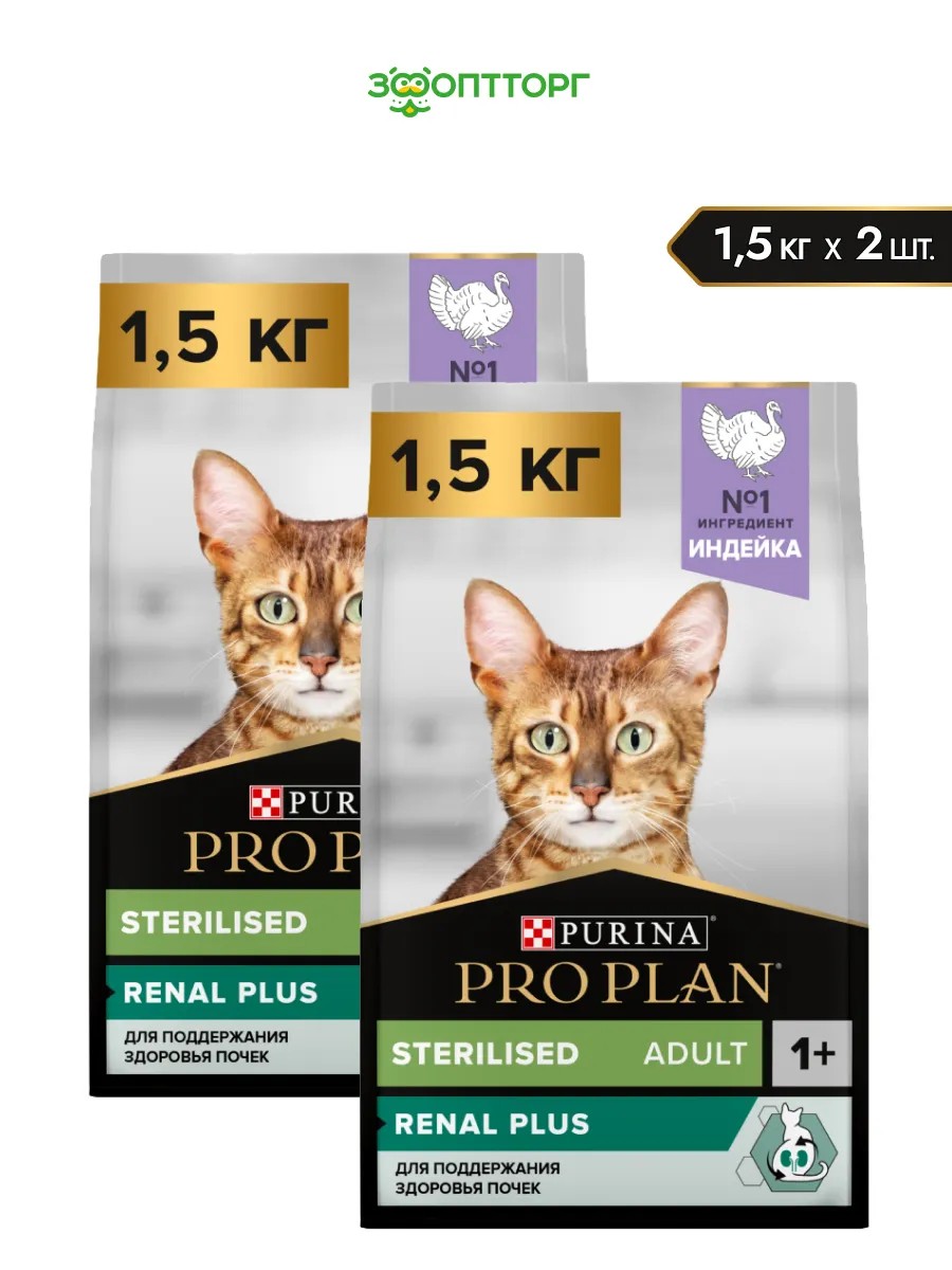 После стерилизации в организме кошек происходит серьезная гормональная перестройка — повышается риск ожирения и развития проблем с мочевыводящей системой. Стерилизованным питомцам рекомендовано особое питание с пониженным содержанием жиров и углеводов, специально подобранным минеральным составом.Команда квалифицированных ветеринарных специалистов разработала рацион PRO PLAN Sterilised Adult RENAL PLUS для взрослых стерилизованных кошек для поддержания здоровья почек*. Этот сбалансированный полнорационный сухой корм c высокой вкусовой привлекательностью создан с учетом потребностей питомцев в высококачественном белке, а также витаминах и минералах, важных для здорового функционирования организма.• Снижается воздействие окислительного стресса на почки через шесть недель кормления**• Создан для поддержания здоровья мочевыводящей системы и идеального веса стерилизованных кошек• Помогает защищать зубы питомцев от образования налета и зубного камняКорм сухой для кошек PRO PLAN Sterilised Adult RENAL PLUS — это полюбившийся PRO PLAN Sterilised OptiRenal с новым названием, но с прежним составом и качеством.Рационы PRO PLAN разработаны на основе современных научных достижений и рекомендованы ветеринарными специалистами и заводчиками***.Московская ветеринарная академия им. К. И. Скрябина признаёт экспертизу компании «Нестле» в области кормления домашних животных.* Этот продукт поддерживает здоровье почек кошек. Если вашей кошке нужна дополнительная специализированная поддержка почек, обратитесь к ветеринару.** Внутреннее исследование Purina: Влияние комплекса нутриентов на показатели здоровья почек на 40 кошках в течение 3 месяцев, 2006, Purina R&D Amiens, France.*** На основании независимого исследования по оценке уровня рекомендаций в каналах ветеринарных специалистов и заводчиков от 04.2023, проведенного компанией IPSOS на территории РФ.