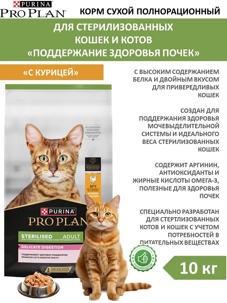 Сухой корм PRO PLAN Sterilised DELICATE DIGESTION для взрослых стерилизованных кошек с чувствительным пищеварением, с высоким содержанием курицы, 10 кг