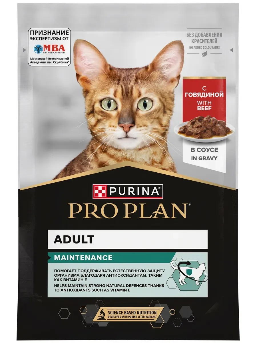 PRO PLAN Maintenance (in gravy) for cats, with beef, 85 g x 26 pcs. PRO PLAN Maintenance (in gravy) for cats, with beef To help adult cats stay healthy, physically active, maintain an optimal body weight, and a beautiful coat, it is important to feed them high-quality food with a balanced nutritional, vitamin, and mineral composition, as well as an appealing taste. A team of qualified veterinarians developed PRO PLAN MAINTENANCE wet cat food with beef. This complete cat food contains a complex of nutrients, vitamins, and minerals necessary for the normal functioning of the body of adult pets. It supports the body's natural defenses with antioxidants such as vitamin E. Contains Omega-3 and Omega-6 fatty acids to maintain healthy skin and a beautiful coat. It helps maintain healthy and flexible joints. Ingredients: meat and meat ingredients (of which beef 4%), vegetable protein extracts, fish and its derivatives, amino acids, minerals, oils and fats, derivatives of vegetable raw materials, sugars, thickeners, vitamins. Guaranteed values: moisture: 79%; protein: 12%; fat content: 4%; crude ash: 2.1%; crude fiber: 0.4%; omega-3 fatty acids: 0.14%; omega-6 fatty acids: 1.27%. Added substances: mg/kg: iron: 13; iodine: 0.39; copper: 0.9; manganese: 1.8; zinc: 19; taurine: 500; IU/kg: vitamin A: 1100; vitamin D3: 153; Vitamin E: 250mg. Feeding recommendations: Combine PRO PLAN wet and dry foods with different flavors and textures to maintain optimal hydration and add variety to your pet's daily diet. An average-sized adult cat (4 kg) requires 3 pouches per day, divided into at least two feedings. Individual cat needs may vary, and daily feeding amounts should be adjusted to maintain optimal weight.