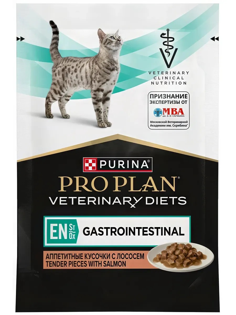 PRO PLAN Veterinary diets EN Gastrointestinal food for cats with digestive disorders, with salmon, 85 g. Pro Plan Veterinary diets EN Canned complete dietary food for adult cats and kittens with digestive disorders. Gastrointestinal disorders are one of the most common reasons for visiting a veterinarian. Gastrointestinal problems are diagnosed in almost every fifth visit to a veterinary clinic, and diarrhea is one of the most typical symptoms of intestinal upset. Regardless of the type of diarrhea, it is important to provide proper nutrition for the sick animal. We recommend using an easily digestible complete diet that is suitable for your pet to reduce the symptoms of intestinal upset. A team of qualified veterinary specialists and nutritionists has developed a complete dietetic food PRO PLAN VETERINARY DIETS (Pro Plan Veterinary Diets) EN St/Ox Gastrointestinal, to reduce the manifestations of intestinal disorders, which is suitable for both adult cats and kittens. Food for cats with gastrointestinal disorders helps replenish nutrients and recovery. Diets with proven effectiveness1, 2 with the same composition and benefits, BACK ON SALE: Easily digestible components help reduce the burden on irritable intestines. Contains insoluble fiber to maintain intestinal peristalsis. Highly palatable for cats with a reduced appetite. Ingredients: Meat and meat ingredients, fish and fish products (salmon 4%), eggs and their products, cereals, processed vegetable products (pea fiber 1.4%), minerals, yeast, oils and fats, amino acids, thickeners, vitamins, sugars. Highly digestible ingredients: pork (liver, kidneys), chicken by-products, turkey by-products, egg powder, rice flour, fish oil