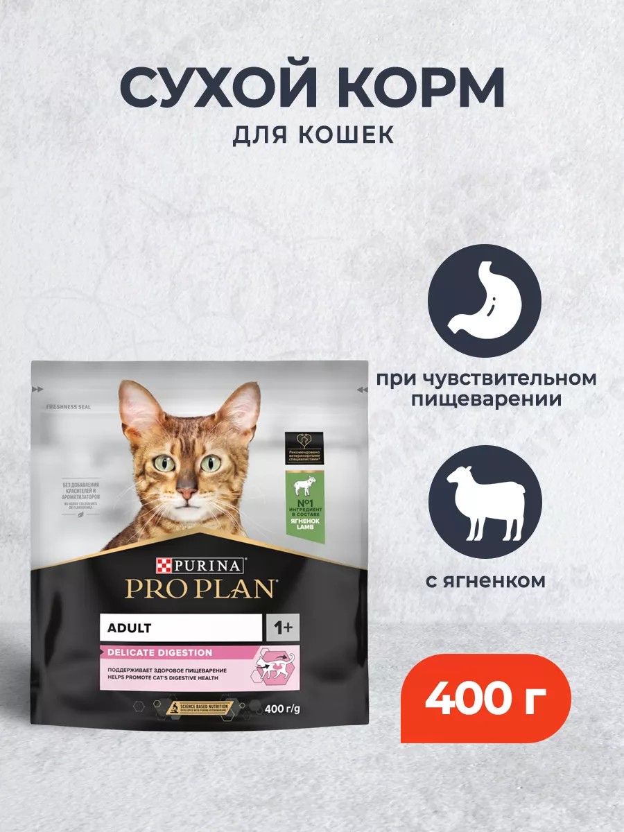 Чувствительное пищеварение у кошки - особенность, которая быстро становится очевидной для хозяина: неприятный запах из лотка, привередливость питомца в еде, затруднения в дефекации. Эксперты PRO PLAN разработали сухие корма специально для кошек с чувствительным пищеварением. Легко перевариваемый сухой корм, в основе которого заложено специальное сочетание питательных веществ, поможет поддерживать здоровье пищеварительной системы. Сухой корм для взрослых кошек с чувствительным пищеварением имеет полнорационную рецептуру. Легко усваивается и способствуют сохранению оптимального веса благодаря отобранным источникам белка. Пробиотические свойства корня цикория укрепляют здоровье пищеварительной системы. Обогащен антиоксидантами для лучшей работы иммунной системы. Разнообразие в питании: сухие корма со вкусом ягненка или индейки.