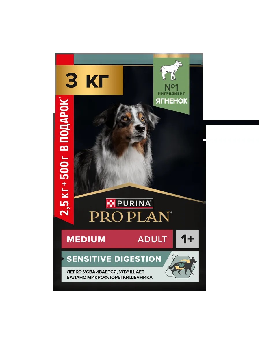 | Полное наименование товара | Сухой корм PRO PLAN SENSITIVE DIGESTION для взрослых собак средних пород с чувствительным пищеварением с ягненком, 2,5 кг + 500 г в подарок |