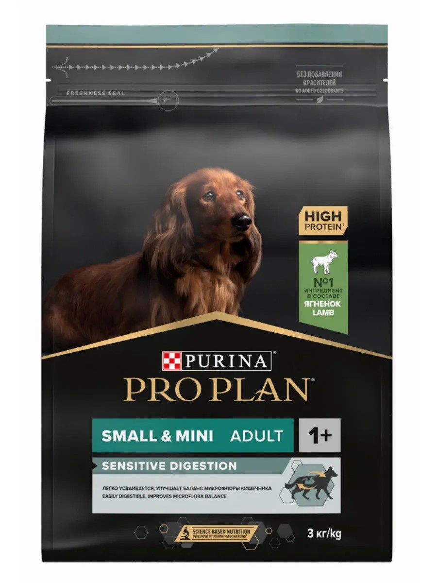 Pro Plan Small & Mini Adult Sensitive Digestion Dry Dog Food for Small and Dwarf Breeds with Sensitive Digestion, Lamb Granules, 3kg / Pet Supplies. Your pet will enjoy and benefit from Pro Plan Small & Mini Adult Sensitive Digestion dry dog food! Pro Plan dog food is designed for adult dogs of small and dwarf breeds with sensitive digestion. This dog food is created using the best technologies from natural ingredients. This dog food will support your pet's health, add energy, and vigor. Sensitive digestion is a fairly common gastrointestinal tract problem in dogs of different breeds. This easily digestible dry food, based on a special combination of nutrients, will help maintain the balance of intestinal microflora. - Lamb is the #1 ingredient in the composition. - No artificial colors, flavors, or preservatives. - Easy to digest. - Contains prebiotics to improve the balance of intestinal microflora. - Contains special ingredients to improve intestinal function and stool quality. The rich taste and pleasant aroma of lamb will definitely appeal to your pet! Dry dog food consists of: high-quality lamb (20%) (including lungs and liver), dry poultry protein, rice (16%), corn, animal fats, corn protein, dried beet pulp (5%), vegetable flour, corn grits, minerals, egg powder, fish oil, hydrolyzed animal protein, yeast, vitamins, amino acids, antioxidants. Pro Plan Small & Mini Adult Sensitive Digestion dry dog food will definitely please your dog with its quality and beneficial properties! Dry dog food / dog products / pet supplies for dogs / food for small breed dogs.