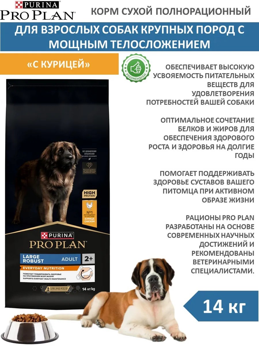 | Полное наименование товара | Сухой корм PRO PLAN EVERYDAY NUTRITION для взрослых собак крупных пород с мощным телосложением, с высоким содержанием курицы, 14 кг |