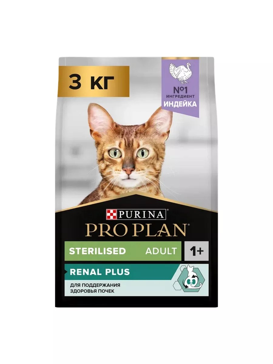 Сухой корм Pro Plan для кастрированных котов и стерилизованных кошек индейка optirenal sterilised turkey 3кг Полноценный сбалансированный рацион на основе мяса индейки для поддержания здоровья кастрированных котов и стерилизованных кошек.