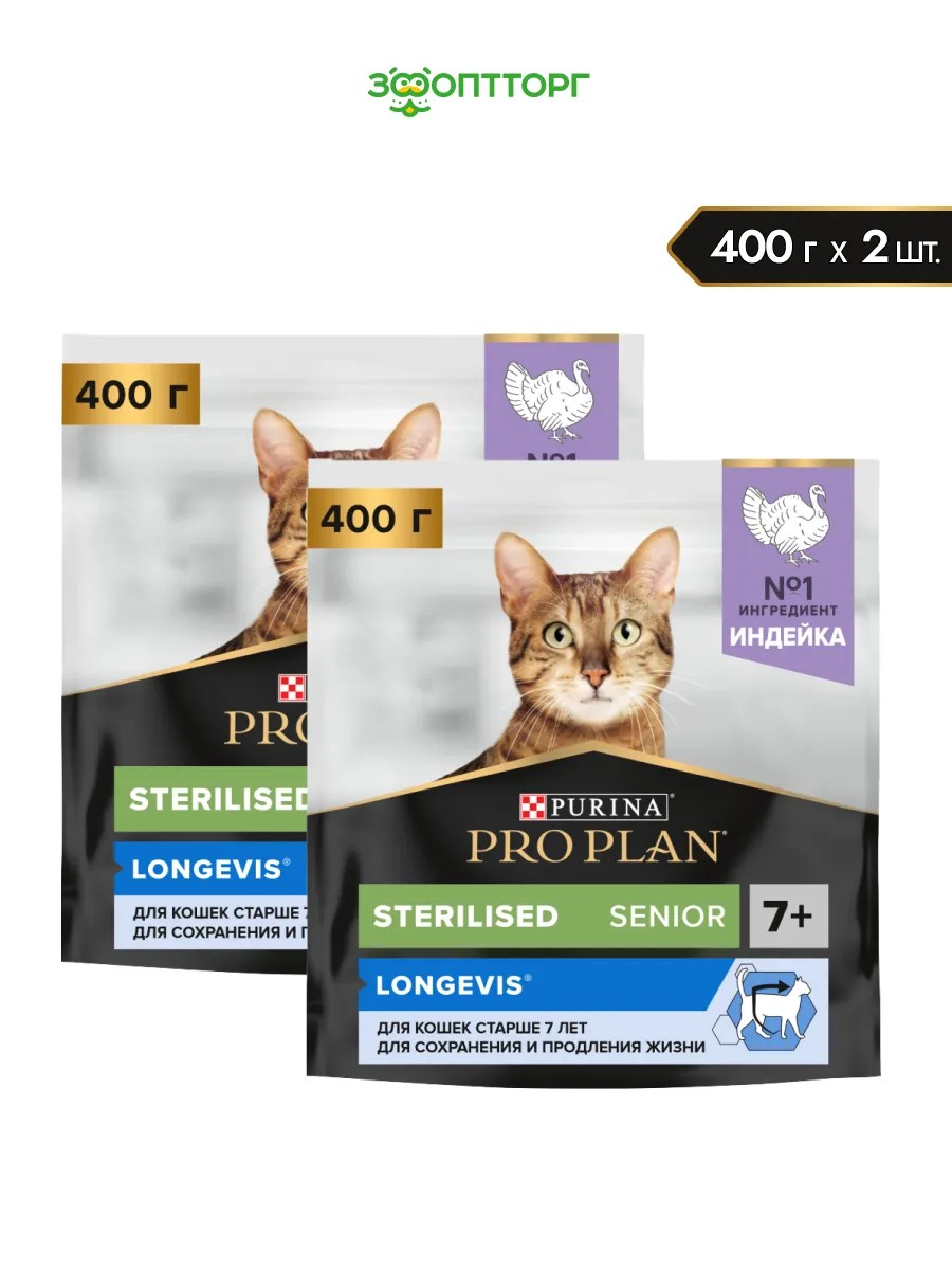 Полное наименование товараPro Plan Sterilised Senior 7+ для кастрированных котов и стерилизованных кошек старше 7 лет Индейка, 400 г упаковка 2 шт.