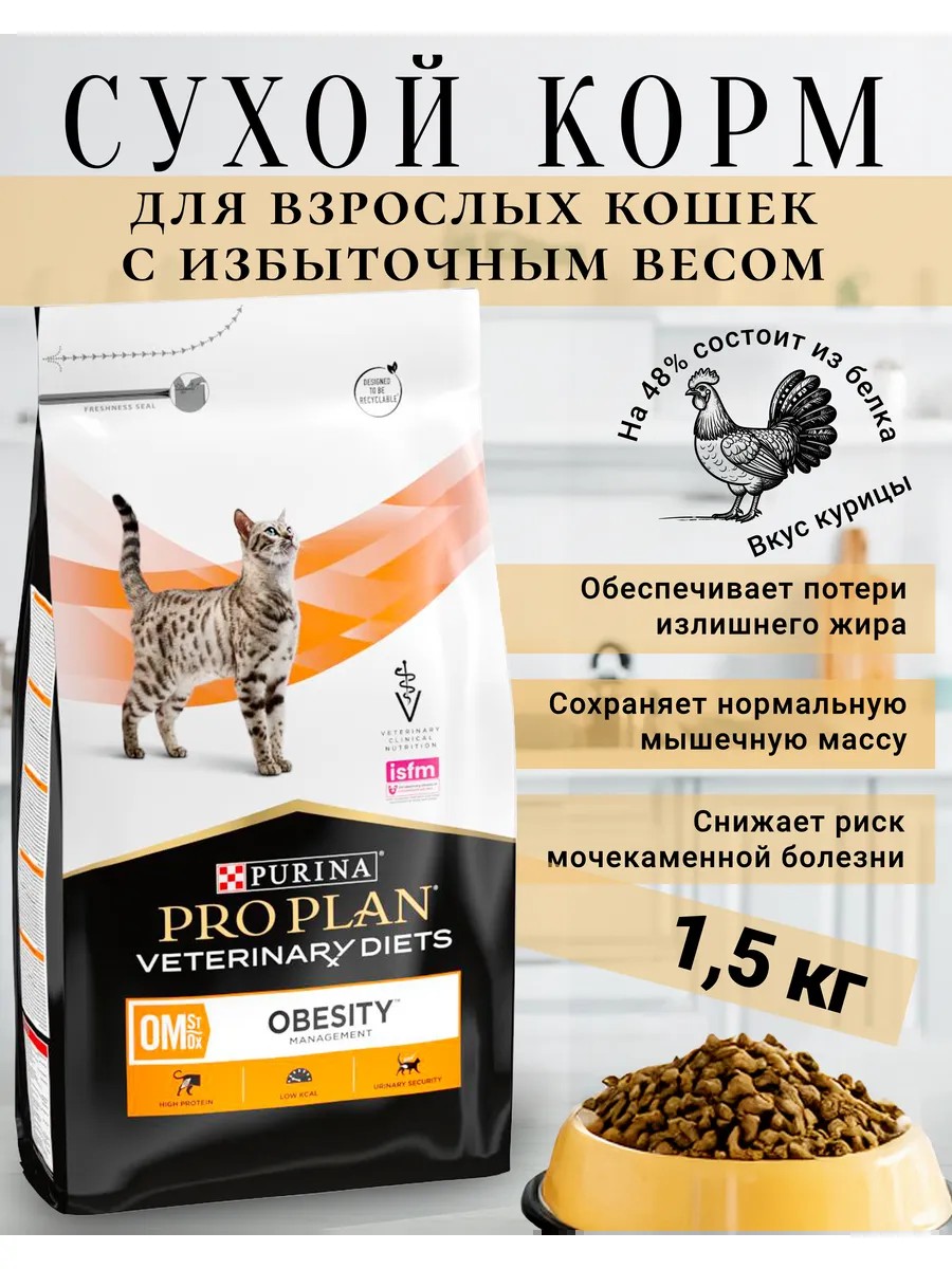 Корм сухой полнорационный диетический PRO PLAN Veterinary Diets OM St/Ox Obesity Management 1,5 кг (Обесити менеджмент) для взрослых кошек для снижения избыточной массы тела, с низкой калорийностью. Использование данного корма рекомендовано под наблюдением ветеринарного врача.