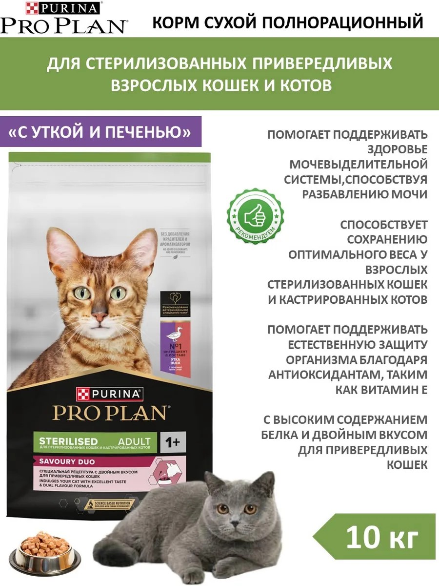 PRO PLAN Корм для взрослых стерилизованных кошек с уткой и печенью 10 кг
